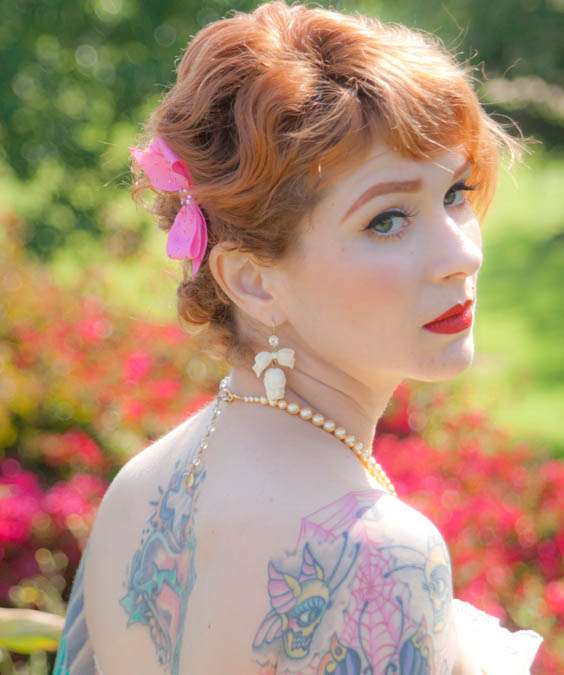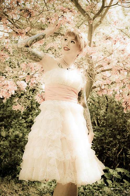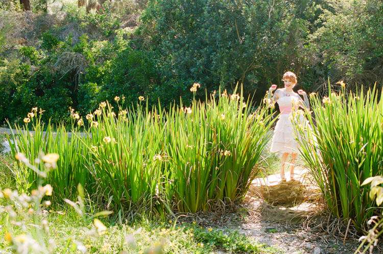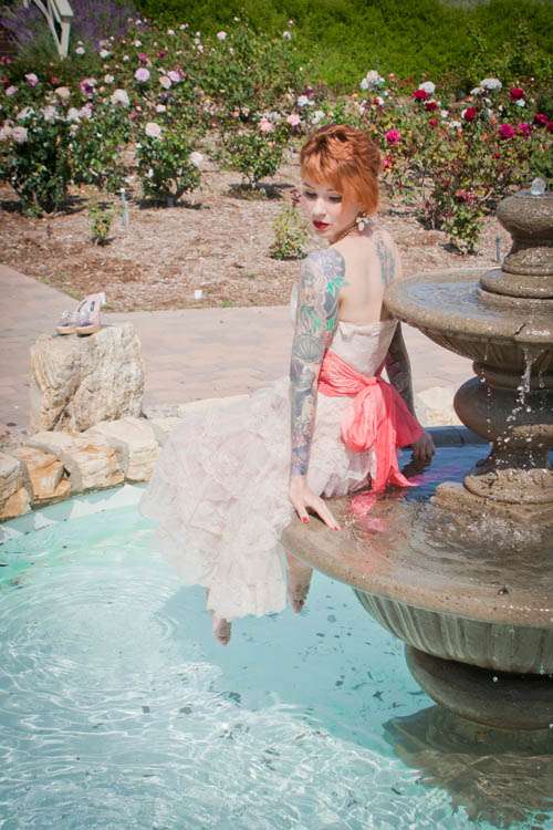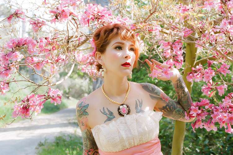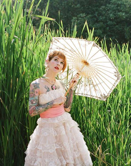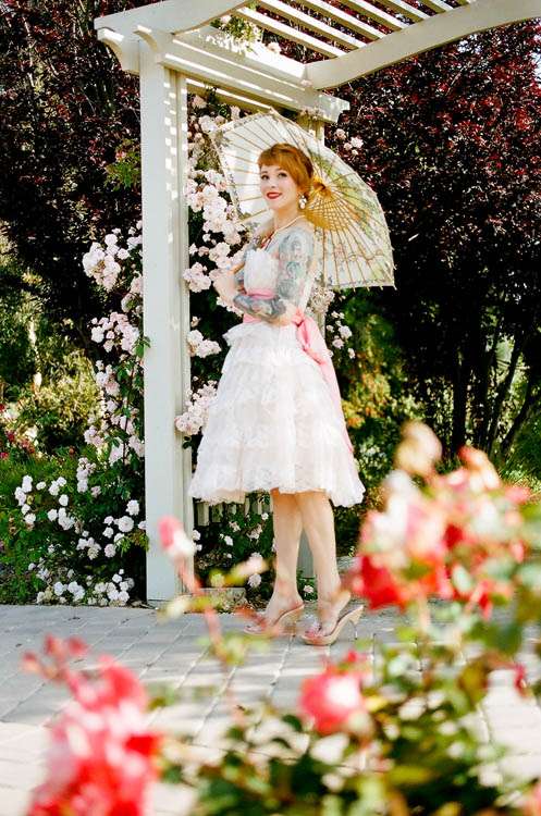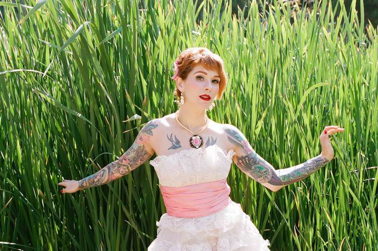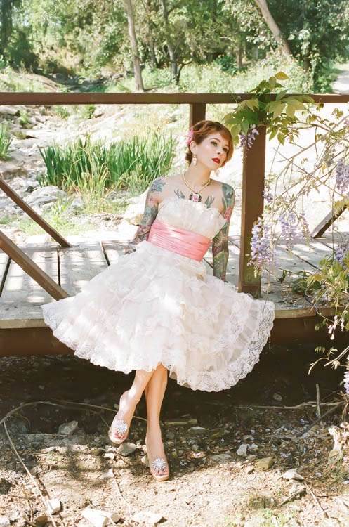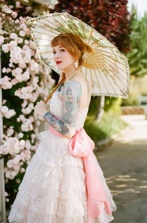 This gorgeous and rockin’ bridal shoot took place in LA and was shot entirely with film, with virtually no post-production. The bride wore a Betsey Johnson dress and shoes and jewellery from Tarina Tarantino. Her cute parasol was from Chinatown Los Angeles.