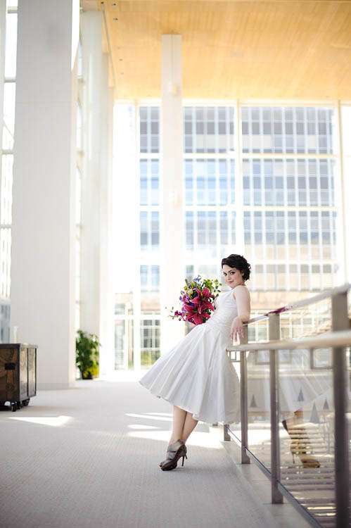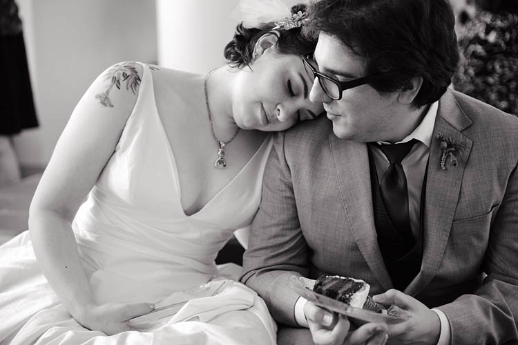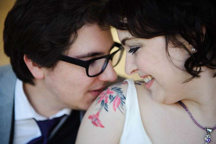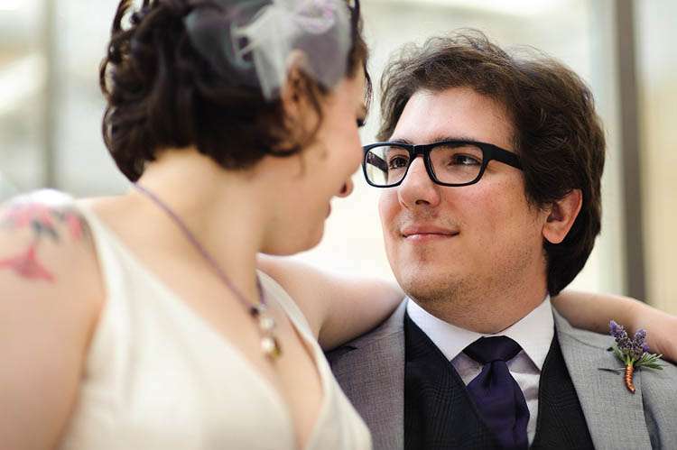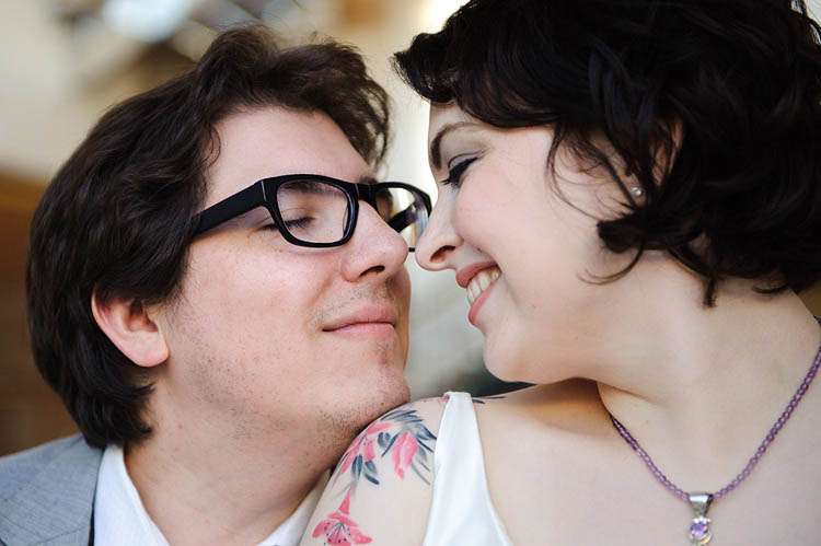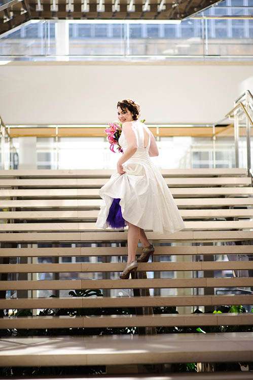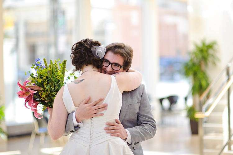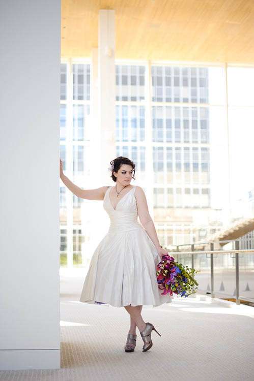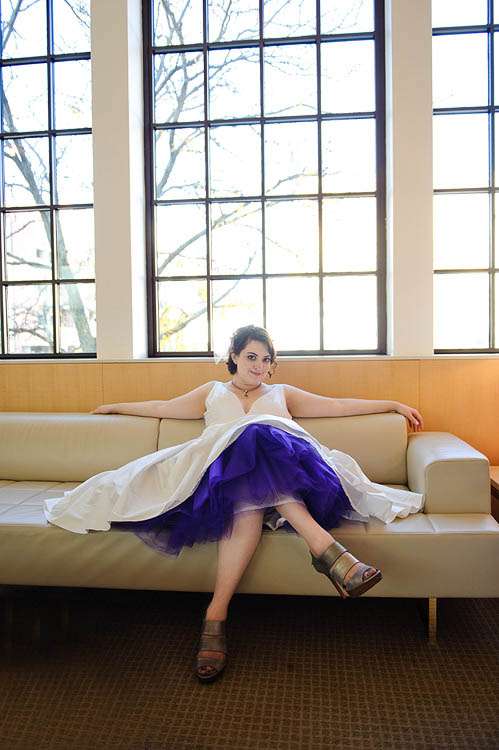 “A couple of time people asked me if I was growing out my hair for the wedding (NO), if I was going to start tanning (NO), and what I was planning to do to cover up my tattoos (NOTHING),” the bride continued. “I didn’t want to look like someone else on my wedding day – I’m a short-haired, alarmingly pale, tattooed woman, so why would I want to hide that? I don’t look like everyone else most of the time, and I didn’t want to look like every other bride. When I told some coworkers that my shoes made me way taller than Zack, they freaked out. I felt like a rock star, though, and Zack’s used to my ridiculous heels, so it was a non-deal.”