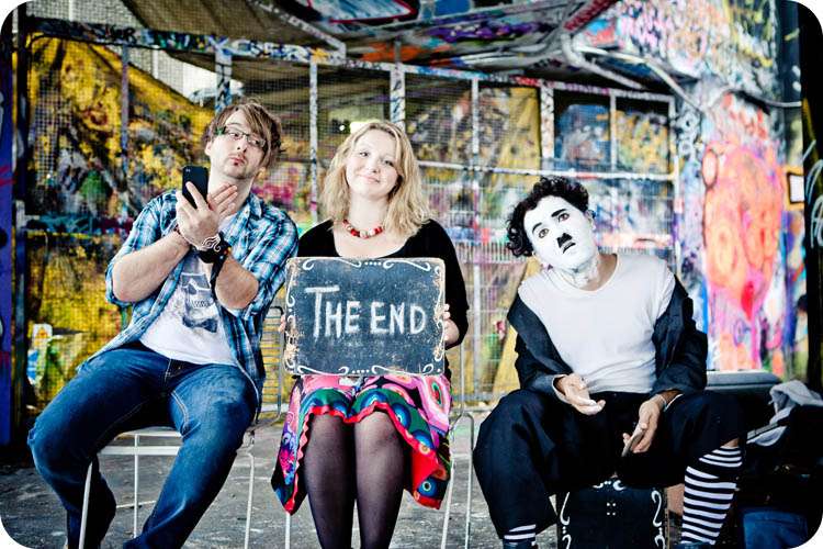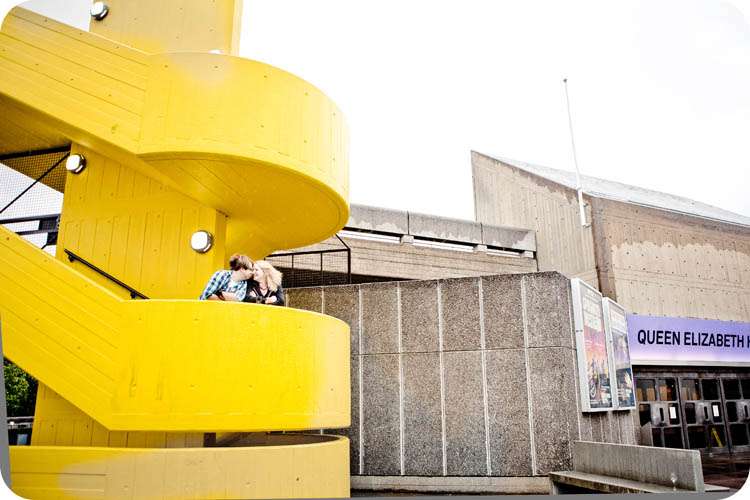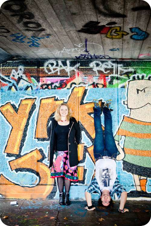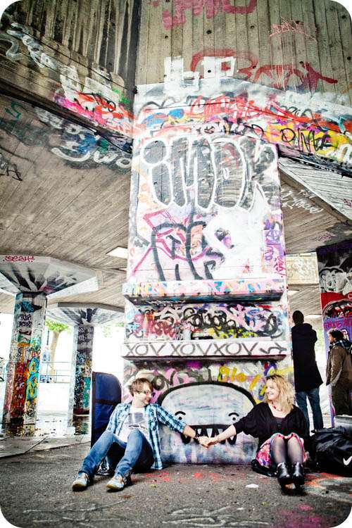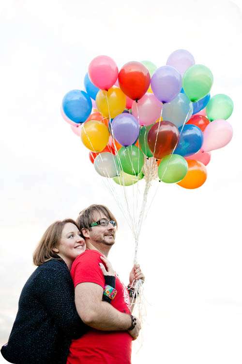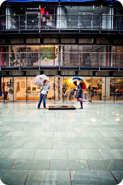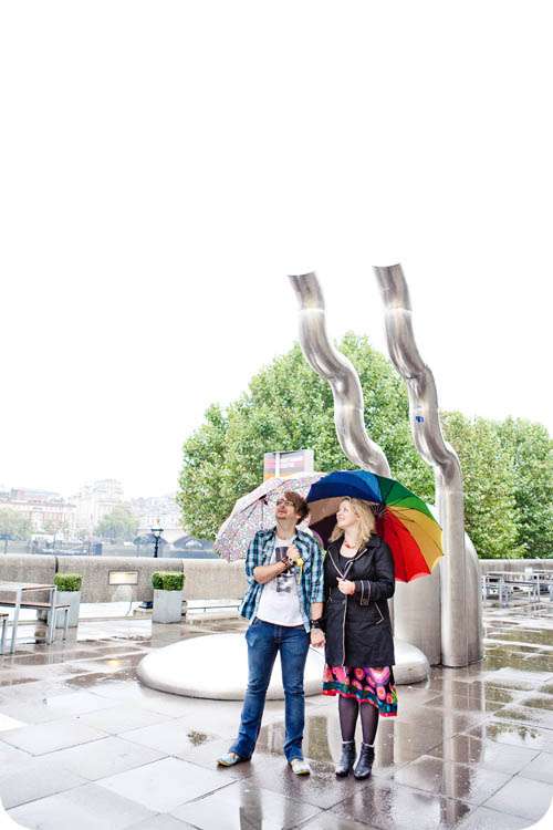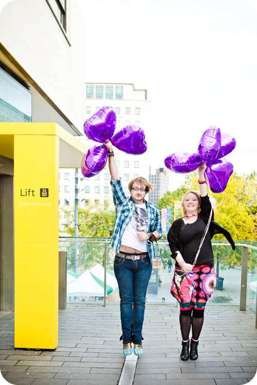 “Inspired by all of this, Shell came up with a whole heap of suggestions including a link to eBay to an item with 100 multi-coloured balloons! Woohoo, ‘Up’ here we come! So, the day of the shoot came and so did the weather. Rain and wind. Unfortunately (or fortunately as it turned out!) this made it impossible to take the 100 balloons on the train with us, so we went with the 10 heart shaped purple balloons in 4 bin bags, 2 colourful umbrellas and 2 heart shaped chalkboards we had bought in Switzerland the week before and we postponed the ‘Up’ shoot until a later date. Great decision! The photos from Part 1 are awesome! The colours from the graffiti on the South bank (you can’t see the strange looks we were getting from the skaters!), The Charlie Chaplin – who asked to borrow Amanda’s mirror, so we asked to borrow him! The giant ampersand, The yellow staircase, The aquarium – all awesome!! And we had such awesome fun posing, jumping in puddles and generally larking about. Even when the wind blew a bag full of the balloons down onto the beach of the Thames, meaning that I had to clamber down and run along the beach after them (much to the amusement of the tourists), it was still fun!”
