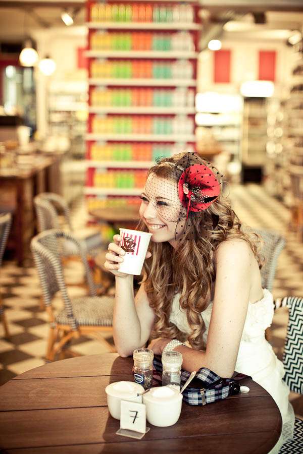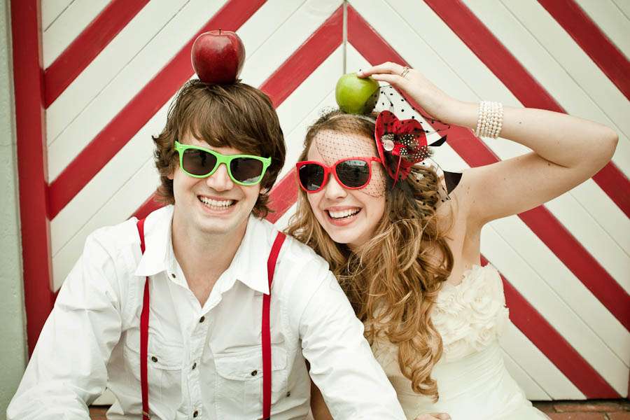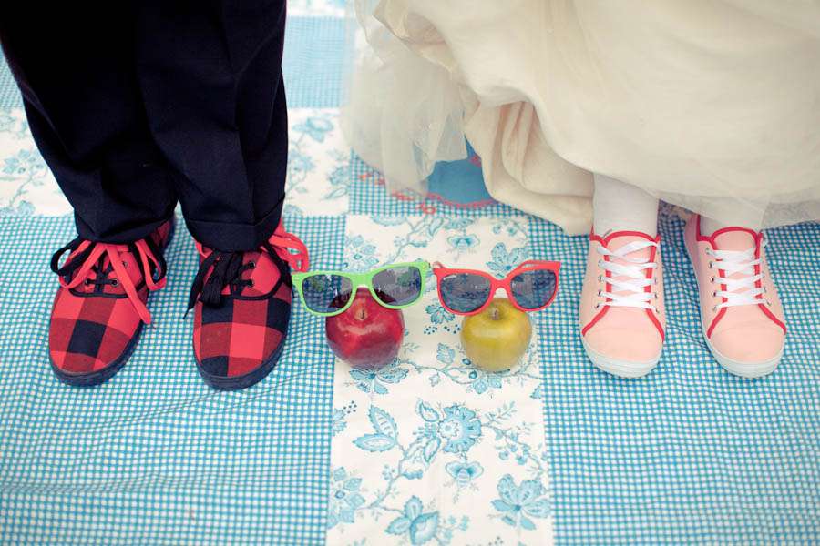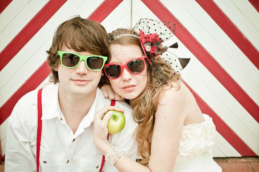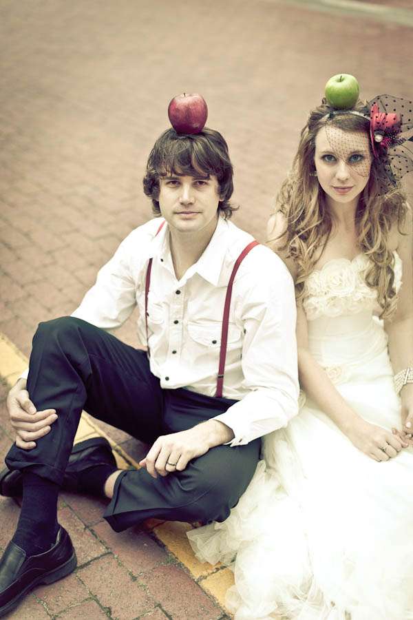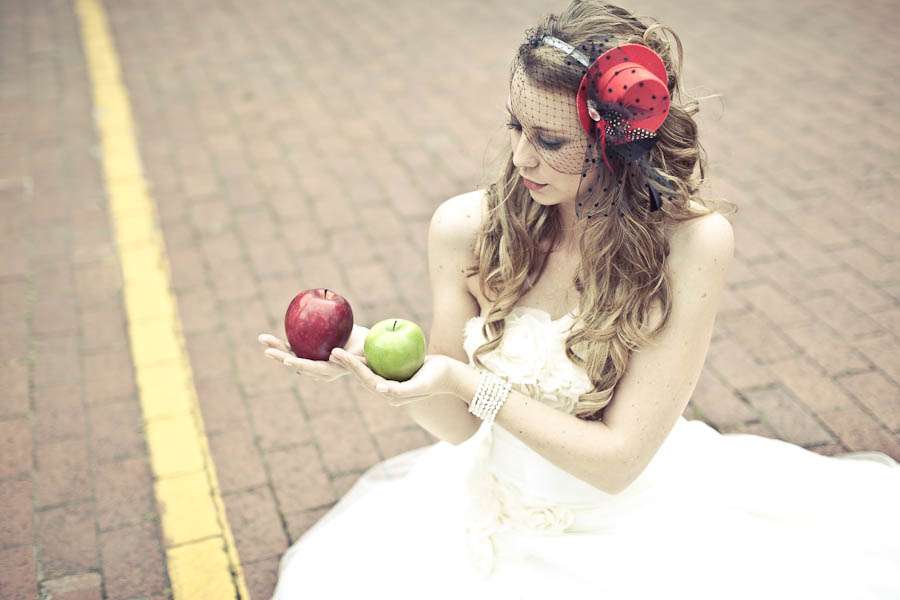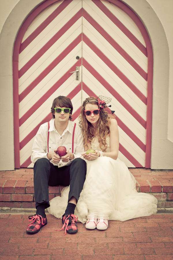“My husband and I are both students and so we had to wing our outfits for the trash the dress session.” the bride told me. “It was actually very fun to walk around gathering ideas from costume shops and low budget chain stores. Our main venue for the shoot was red, black and white, so these become our colours of choice. We wanted to bring in more way-out colours and used the apple red and apple green sunglasses which were repeated in the two different apples found on some of the photos. My wedding dress is your typical fairy princess dress – and our wedding photos move along that theme. Emil and I like diversity, so we decided to do something a little bit different for the photo session.”