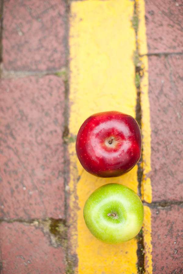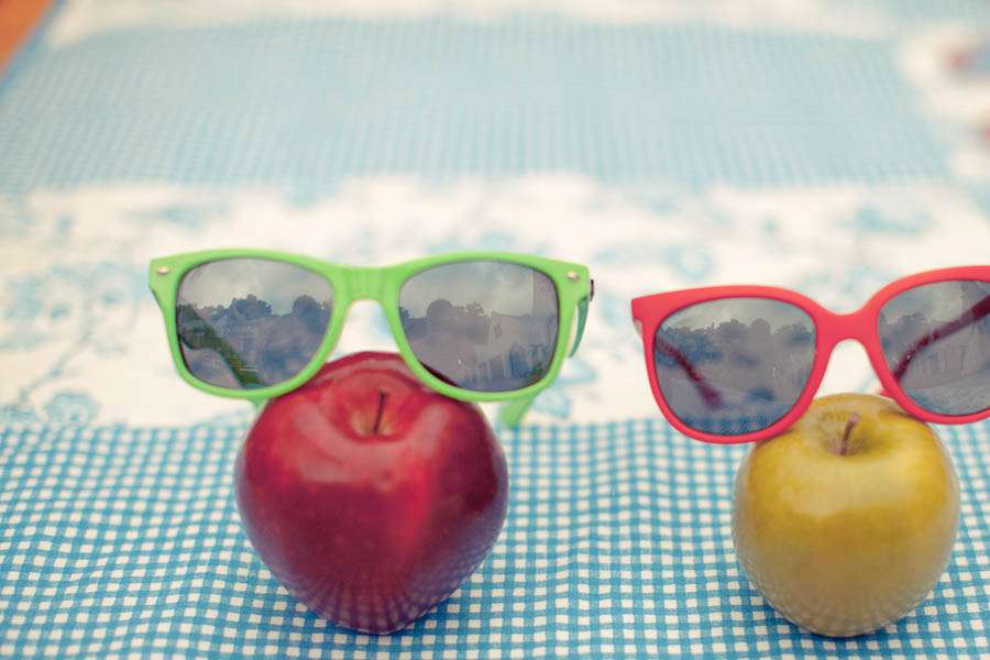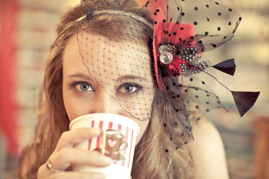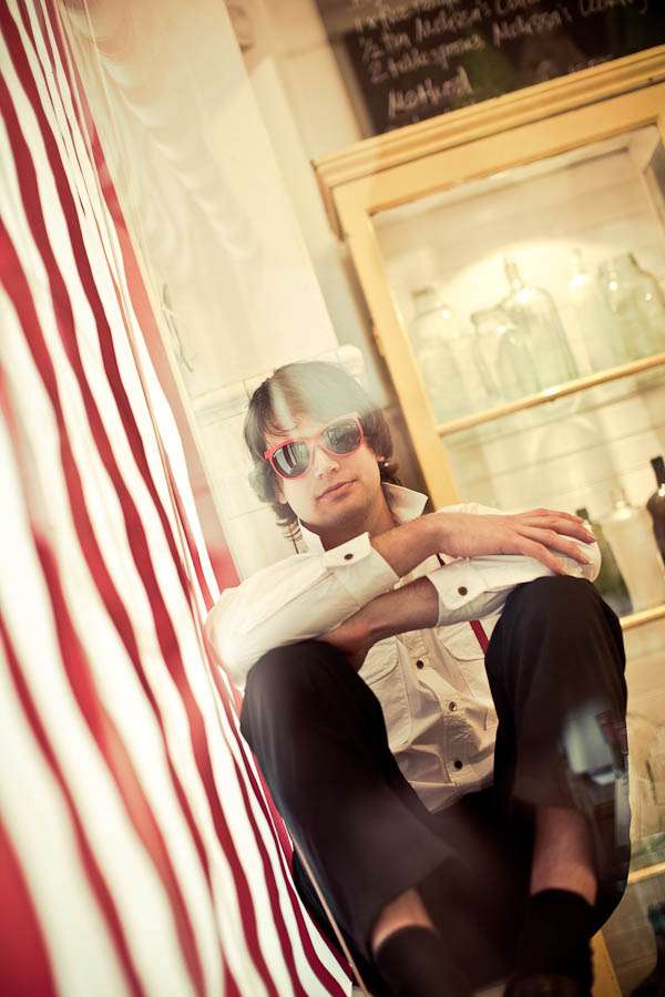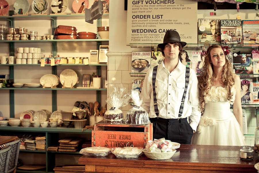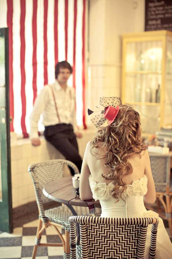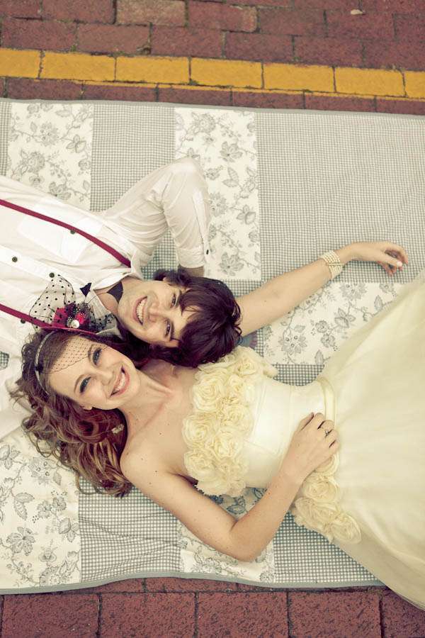 “My husband and I are both students and so we had to wing our outfits for the trash the dress session.” the bride told me. “It was actually very fun to walk around gathering ideas from costume shops and low budget chain stores. Our main venue for the shoot was red, black and white, so these become our colours of choice. We wanted to bring in more way-out colours and used the apple red and apple green sunglasses which were repeated in the two different apples found on some of the photos. My wedding dress is your typical fairy princess dress – and our wedding photos move along that theme. Emil and I like diversity, so we decided to do something a little bit different for the photo session.”
