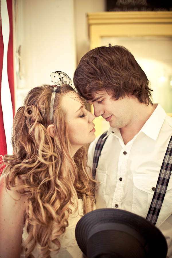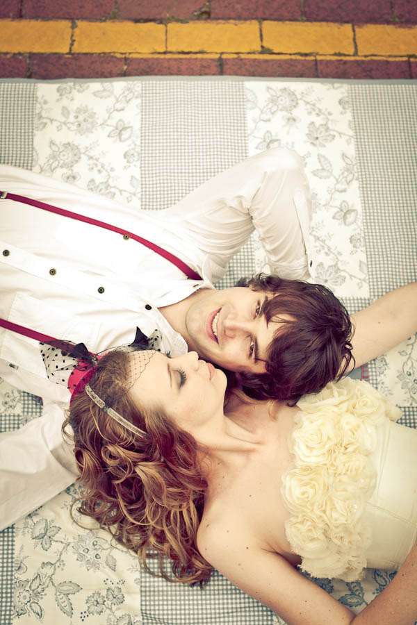 “My husband’s wedding suit was a similar case to my wedding dress. It was a lovely suit, but we thought it a bit too formal for our trash the dress session. So, we chose a basic ‘background’ (white billowy shirt and black pants) and started searching for our different elements. We were clothes shopping one day when we came across the hat he wore; thought it was very debonair and that was that. The suspenders, like the shoes, brought in the red and a bit of funkiness.”