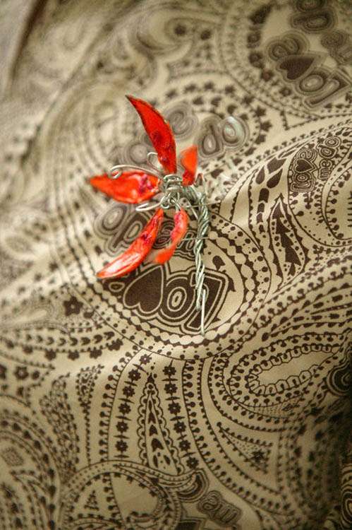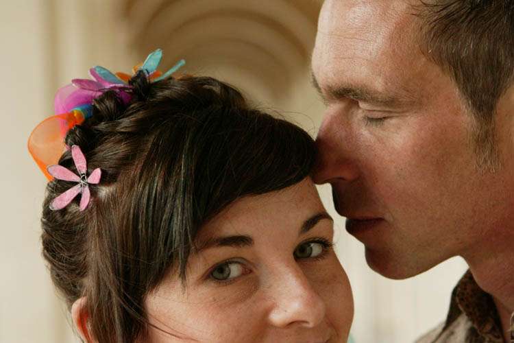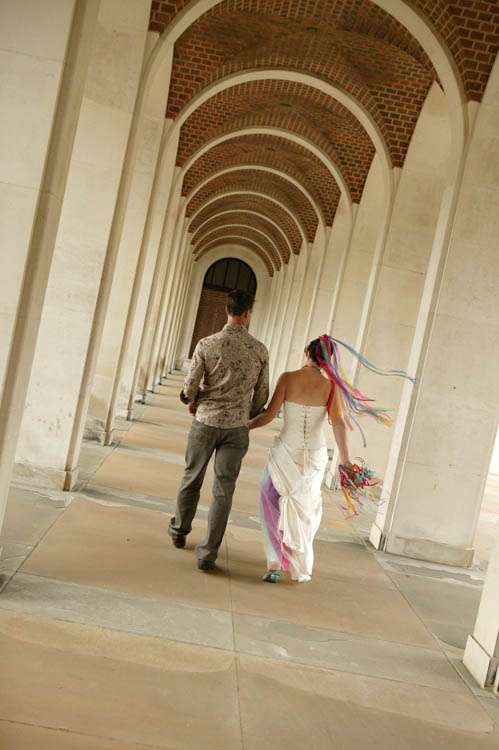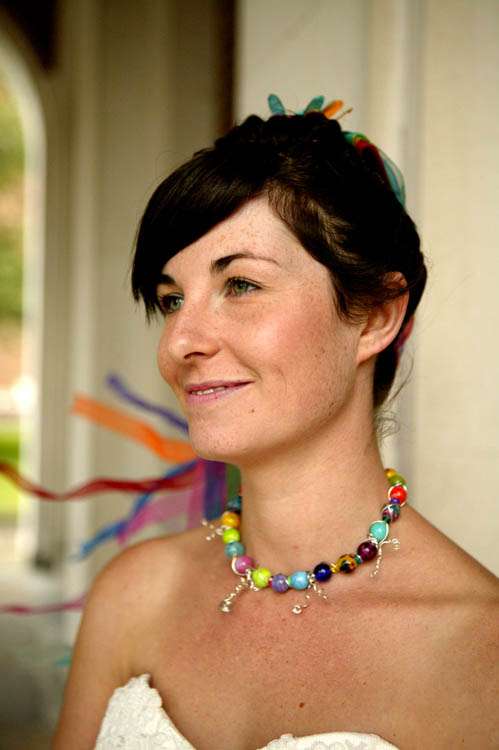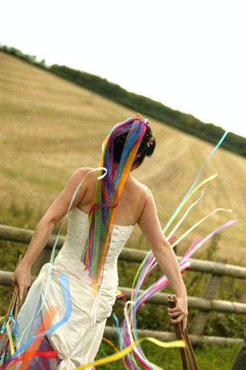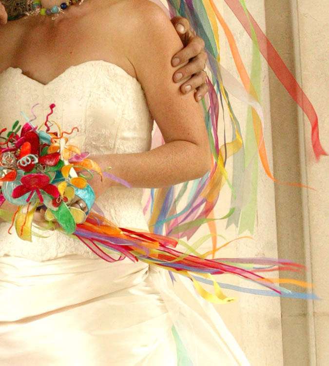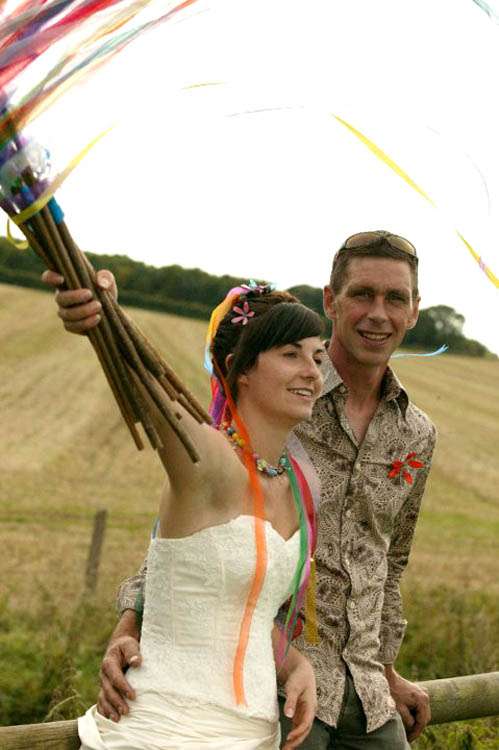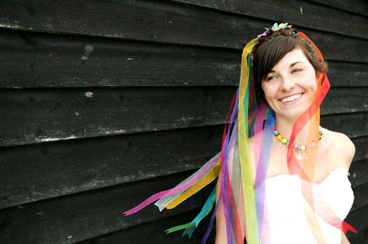 “My bouquet was made from garden wire (bought in a garden centre), tissue paper and pva glue,” continued the bride. “I used pliers to twist and shape the wire into funky flower shapes, then using a bit of a paper mache technique covered them in different coloured tissue paper, applying layers of glue and paper. I got lots of friends to help out with this. I finished it off with loads of different coloured organza ribbons.”