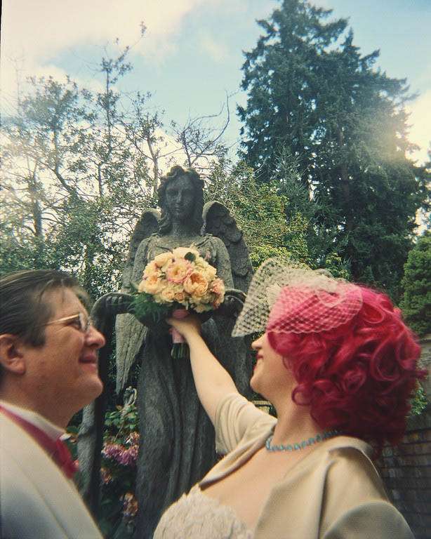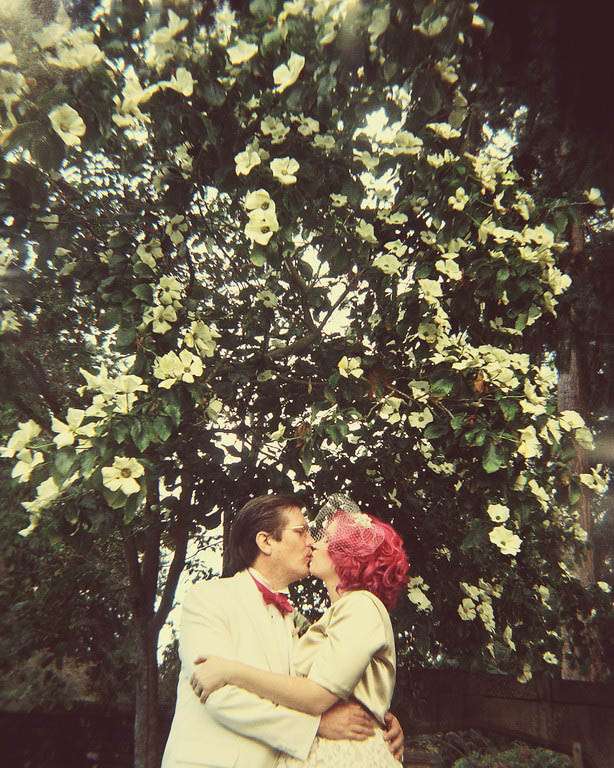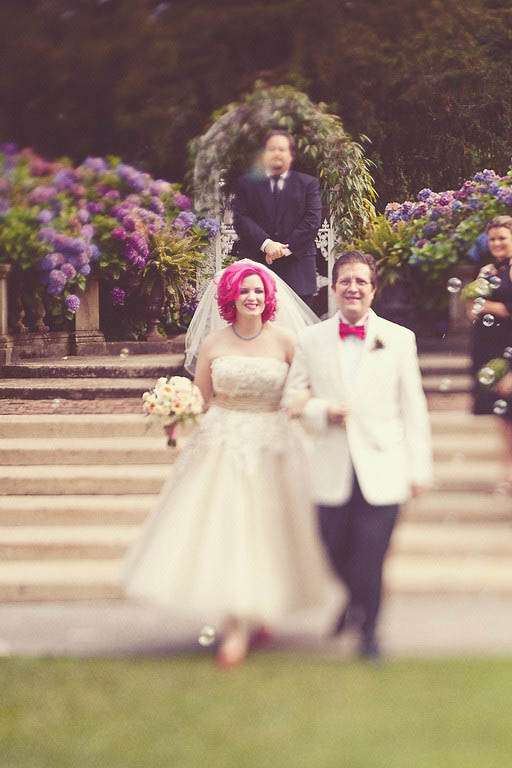 With her perfect dress Melinda wore sparkly red, custom made ‘Ruby Slippers’ replicas from Cybertosh on etsy. “I loved the look of wedding dresses with bright shoes, and ruby slippers just seemed right for me. The Wizard of Oz was the first movie I think I ever saw and I’ve loved it for as long as I can remember. I think these are probably at least the 10th pair of ruby slippers I’ve owned over my lifetime (although these are certainly the most accurate!)” She made her own veil and head piece and wore heirloom jewellery. To match his bride, who actually dyed her hair pink especially for the wedding (and she’s kept it pink since!) Stu wore a white dinner jacket and pink bow tie which Melinda made herself.