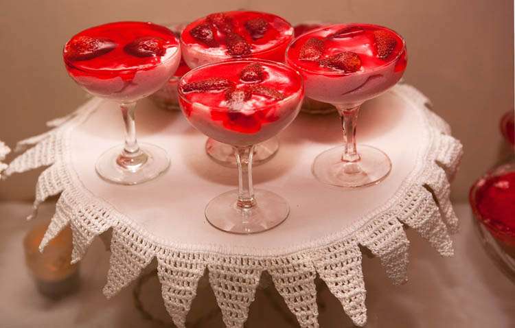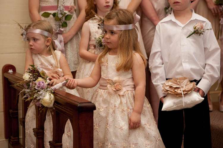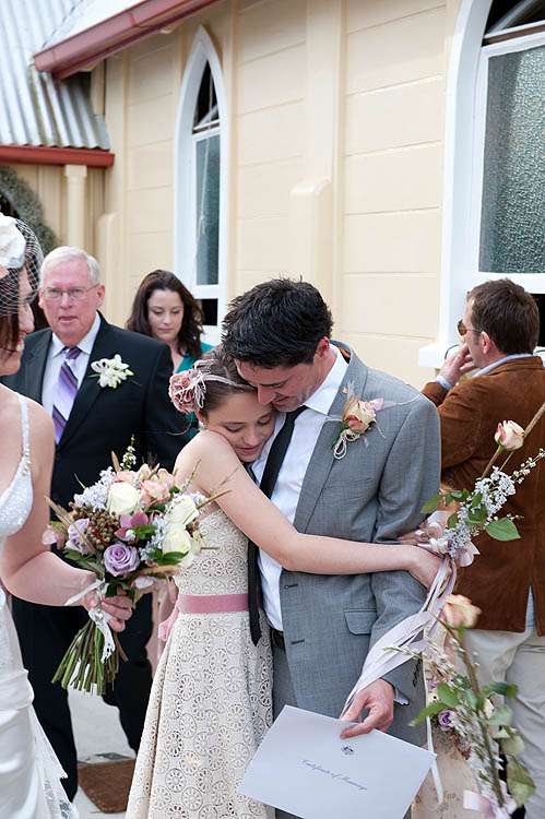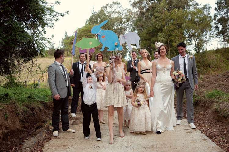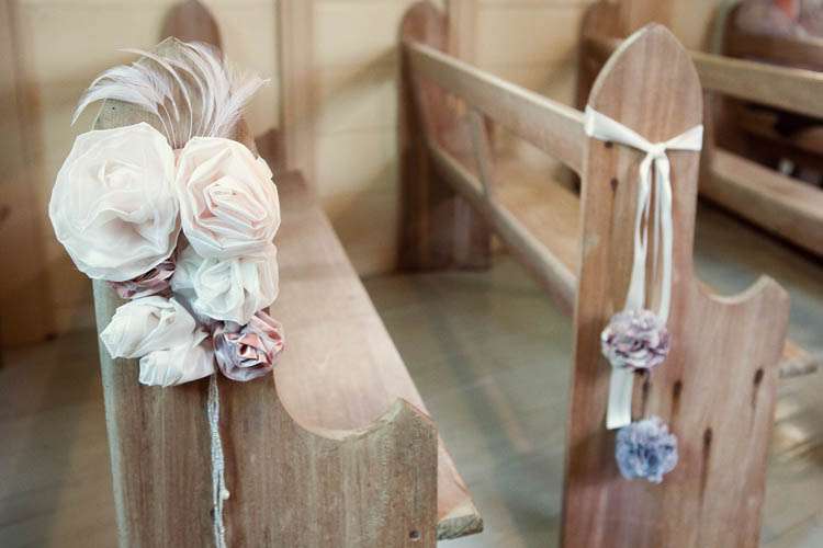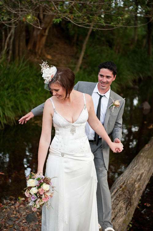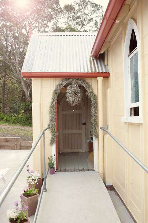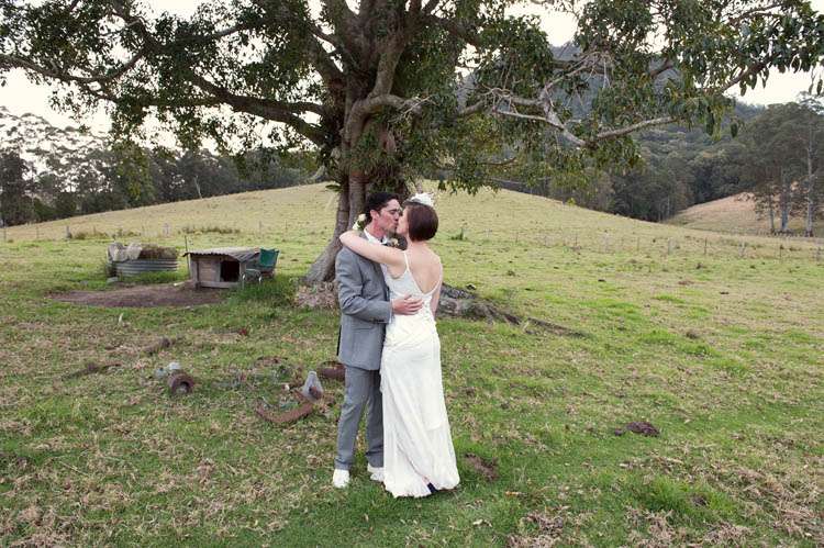 Michelle & Sterling were married at St Barnabas church, in the middle of the Aussie bush. Their reception that followed took place at Upper Landowne Community Hall. Michelle’s parents had been married at the same church and hall 35 years ago so it was really special to them to also be married here. The importance of involving their families was continued throughout the planning process. “My mum and Grandmother did so much work ,” said Michelle. “Mum organised all the catering which was done by the local church that my Grandmother belongs to and all of the table cloths, linen napkins were hand crocheted by my Grandma. My sister made the guest book sign and we all decorated the hall and set the tables and did the flower arranging in 30 silver tea pots that I bought over time from eBay ! They looked awesome and totally fitted with the romantic, quirky theme. We even found a home for the 80 massive paper tissue pom poms we made.”