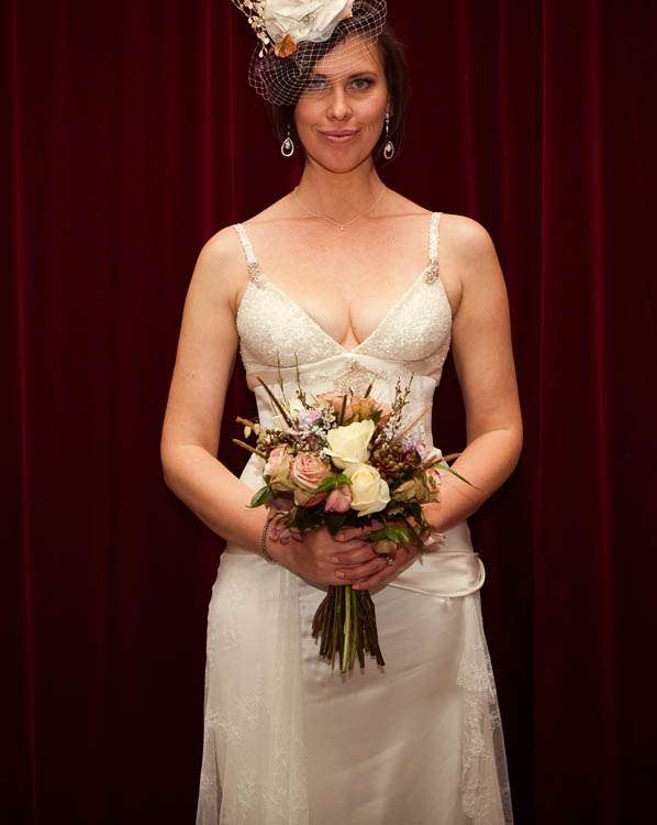 Michelle wore a dress by Pallas Bride, Sydney, “I choose this dress as I wanted something kinda “bridey” but with a twist – I loved the lace and the plunging neckline as well as the sequence details.” To give her bridal look a Rock n Roll twist, Michelle added purple shoes by Paul Dane and a handmade bespoke headpiece by Suzy O’Rourke. She asked her bridesmaids to choose their own dress. Their looks were tied together with their headpieces which she made herself with fabric and her trusty hot glue gun!