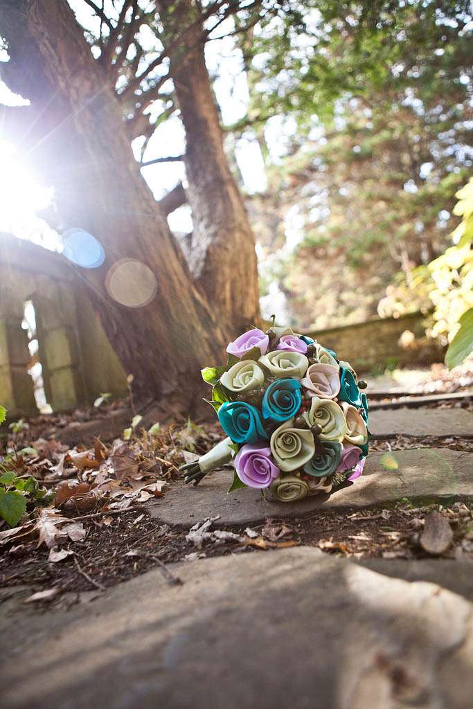 The gorgeous silk ribbon fabric flowers came from JoeNet2 on etsy, “The seller, Annette, was great,” continued Mo. “I told her my ideas and she sent me an envelope filled with color swatches of ribbon for me to choose the colors from. She even threw in a free flower girl bouquet and boutonniere for Chris.”