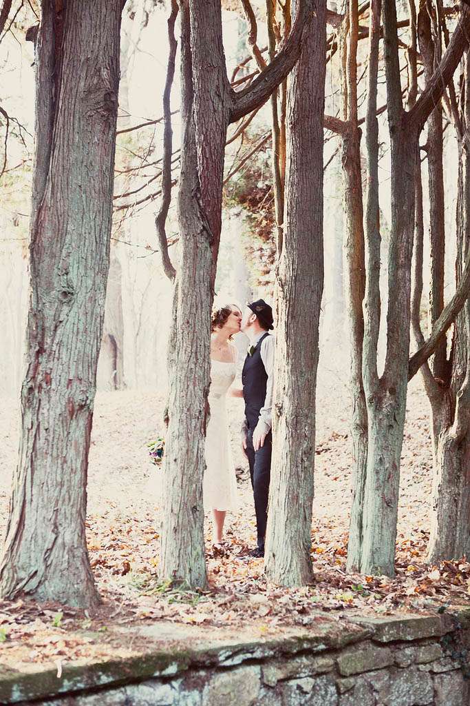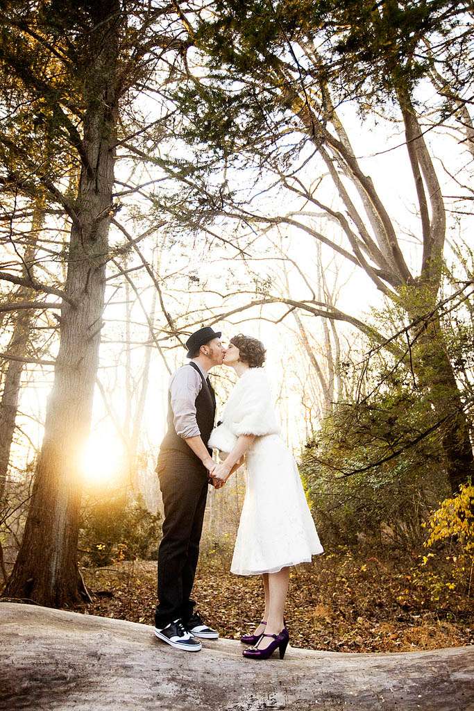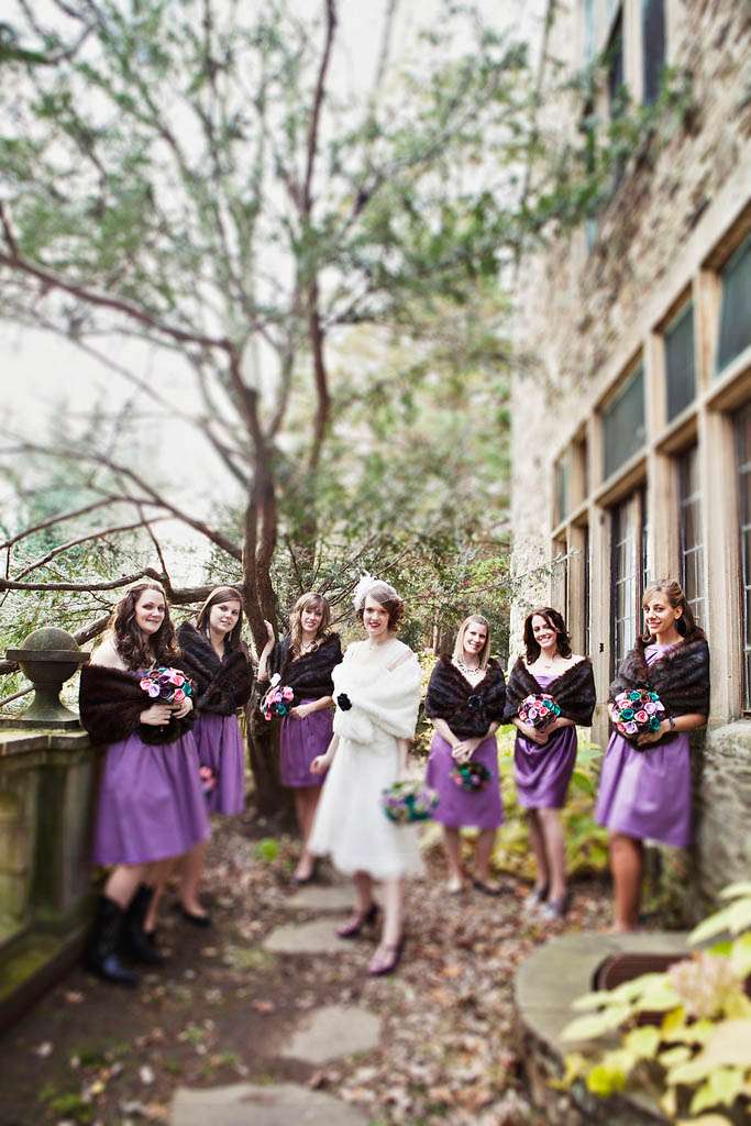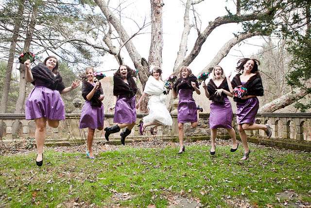 Mo wore a tea length dress with amazing purple shoes which actually set the colour scheme for the entire day! “My dress was actually from David’s Bridal and so were the bridesmaid dresses. I was really set on a tea length dress. I have this affinity for the corporate wedding money machine but didn’t want to buy my dress online. It all came down to convenience. My friends were all different body types and some live in other parts of the country so I wanted to make sure they could all pick styles that made them feel dead sexy. We got a discount on the bridesmaid dresses because I bought my dress there. My veil and feather hairpiece were also from David’s Bridal. The sales lady put them in my hair when I tried on my dress and it made my Mom cry so we got them. That was a smart sales lady.”