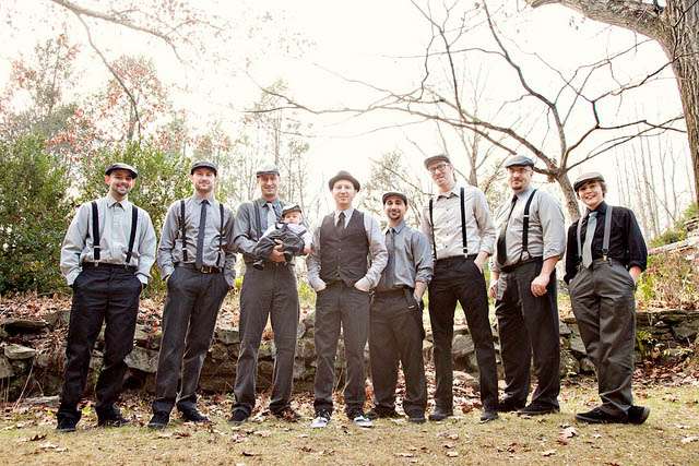 Mo & Chris wedding inspiration came from the 1940’s and the fact that Chris is an old Ska kid. The bride explained, “For our clothes we decided we wanted a vintage feel. Chris wanted to stay away from tuxedos and suits and being an old ska kid at heart he wanted to have a vintage swingers kind of style. He gave the groomsmen their flat caps as a gift, they all picked their own colors, and he wore a black fedora with a feather in it. He told them to get grey shirts and black pants. The suspenders were my favorite part.”