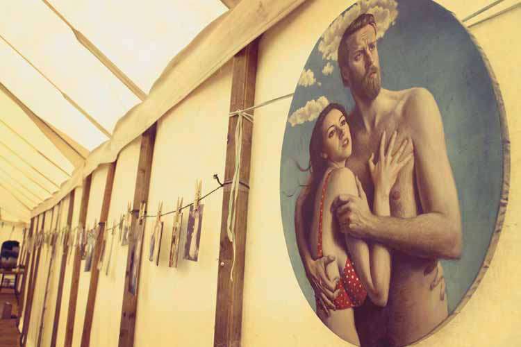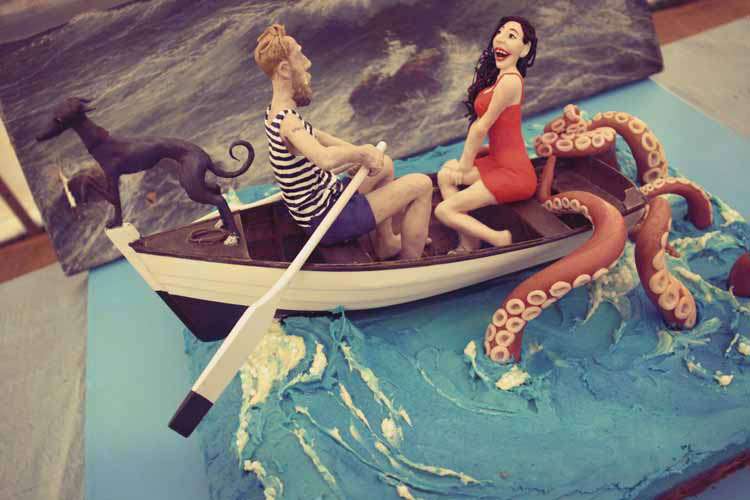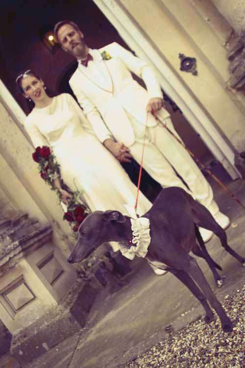 Polly & Stuart’s wartime inspired wedding was held in a marquee in Polly’s parent’s back garden. “We love vintage style from the 1930’s-1960’s. We wanted to incorporate our love of 1950’s Rock n Roll into our wedding and combine it with the aesthetic of a wartime garden party,” explained the bride. “We furnished our marquee and gentleman’s smoking room with pieces of furniture, decor and paintings from our home. I can safely say that I don’t think that anyone else has ever had a 1940’s waxworks dummy in their wedding marquee! We also wrote our own ‘hymn’ for our wedding service. We put sticks of rock on all the tables.We combined stylistic references and it worked- We backed the stage with 1950’s style working men’s club red curtains and had Victorian birdcages stuffed with ivy and pearls suspended from the ceiling. We turned my parents’ summer house into the ‘gentlemen’s smoking room’ complete with pipes, silk smoking jackets and a drinks cabinet. We had our dog Enid Mouse as our whippet of honour. Our magnificent nautical cake complete with Marzipan octopus tentacles was by Annie at Yummy Nice. The cake was topped by a sculpture of us in a boat made by my husband Stuart. We didn’t want to be constrained with any particular rules!”