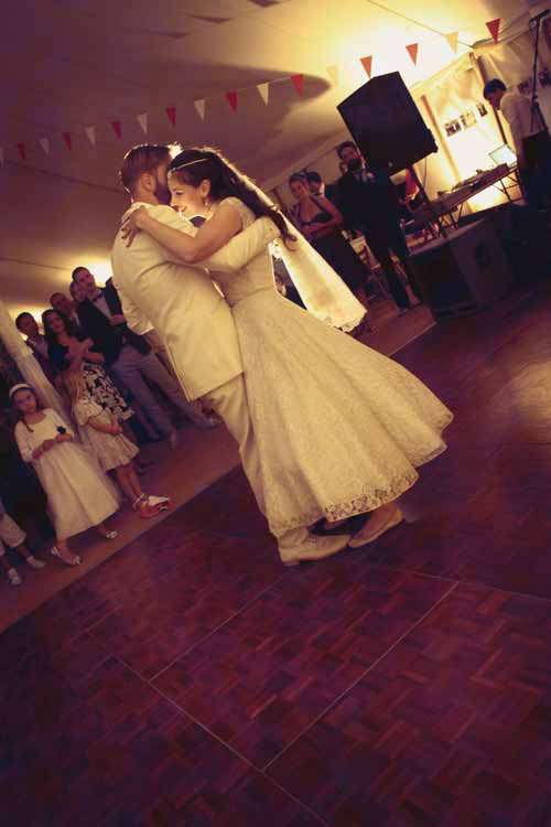 For the centrepieces and reception decor, the couple hired vintage crockery from A Most Curious Party. The tea cup displayed were a DIY effort by the bride’s Mum and friends. “For our afternoon drinks reception and dinner we had the wonderful DJ 78 who played a divine selection of tunes on his gramophones and he went down an absolute storm!” continued Polly. “Our rockabilly band were the fabulous Rhythm Aces who kept the dance floor filled all night with great 50’s Rock n Roll. The music at our ceremony was performed by our musician friends Michelle and Susie. Michelle performed on our 1870’s American parlour organ which we transported (with the help of 4 very strong men) from our bedroom in London to our wedding venue in Suffolk!”
