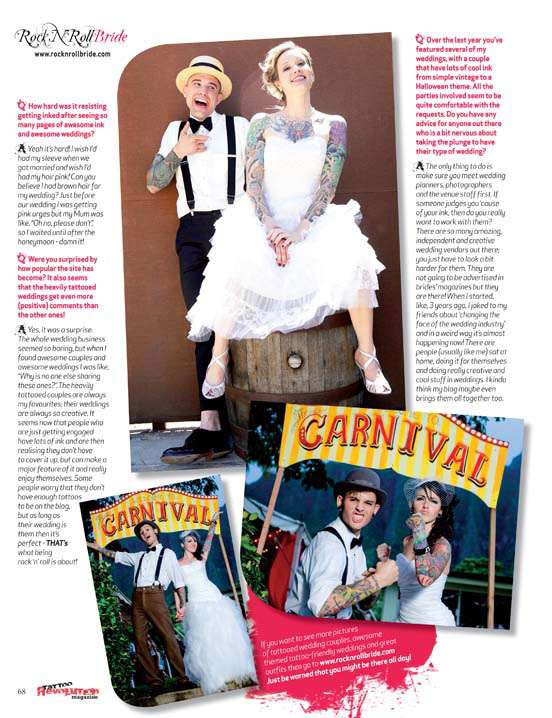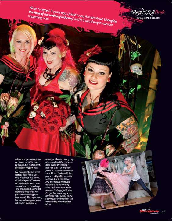 So in September, I headed to one of my favourite bridal shops, Fur Coat No Knickers in London, to do the shoot. I brought along my personal (hehe!) and favourite hair and make up gal, Elbie Van Eeden and the Rock n Roll Bride intern, Alice, for the ride too. You can read all about our day’s shooting here, but for now, I hope you enjoy looking at the (four page!) interview where I chit chat all about my love of ink and tattooed weddings.