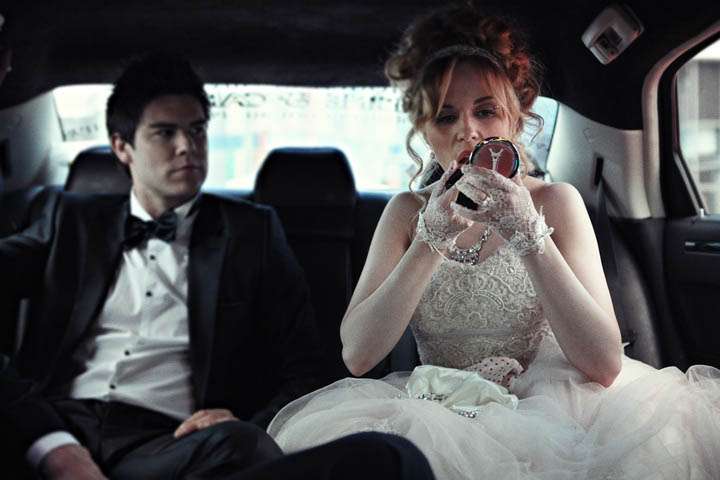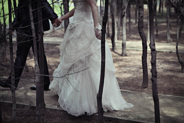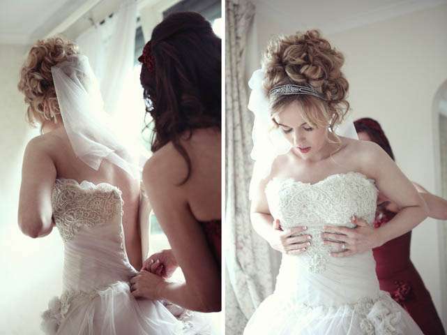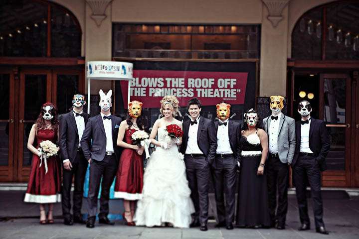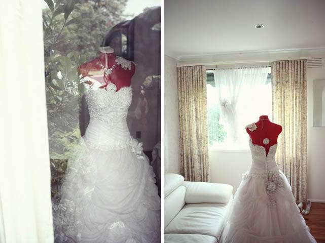 To match their stylish pets, the couple went all out with their wedding day attire. The bride wore a Swarovski crystal encrusted gown from Bernadette Pimenta Bridal Couture which she altered herself to make it perfect for her. “I made the corset and underskirt – I pulled it apart changed the dress, added tulle, lace, Swarovski crystals, redesigned the skirt and upper bust and all the rosettes the week before the wedding. I changed the dress because the dress didnt turn out as I had imagined it and it was the wrong colour (fabric stores mistake.) I changed it to make it bigger and lace-ier and make me happier! All the lace and flash tulle was from Tylers Fabrics and The House of Frankie Stuart – these fabric shops are simply amazing!”
