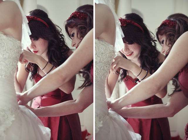 A bride in lace gloves and two bulldogs dressed up for the occasion? Oh yes, Jodie & Virginien’s wedding makes my heart sing! Photographer Britt said she wasn’t 100% sure I’d think their wedding was Rock n Roll enough for a feature when she sent it over, however I had to disagree straight away. I am loving the cute, quirky touches through out in this day – it’s not all about tattoos and pink hair on this blog!