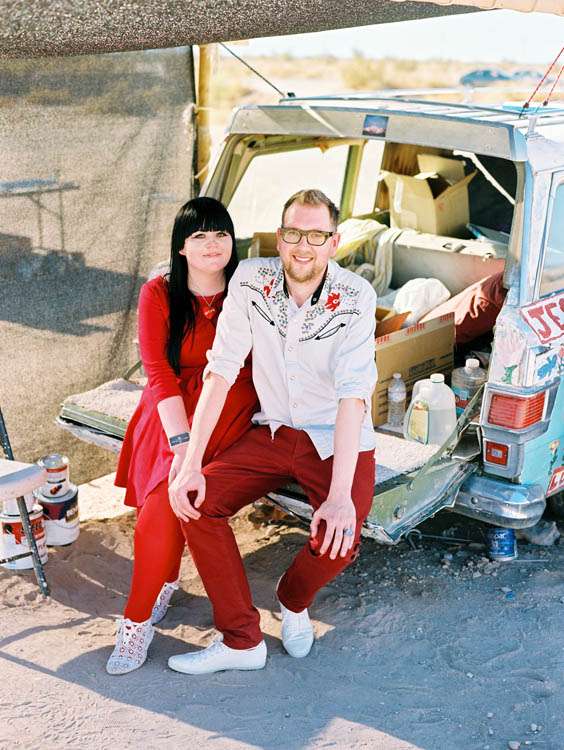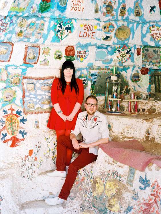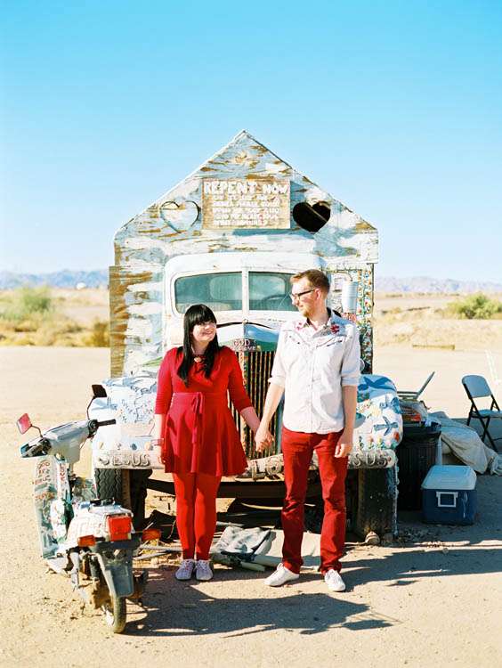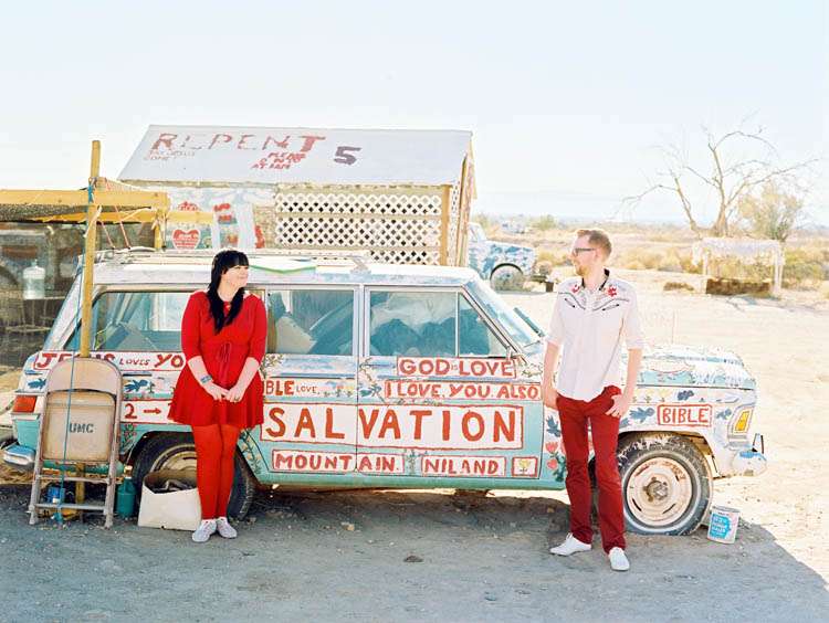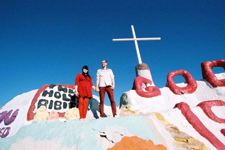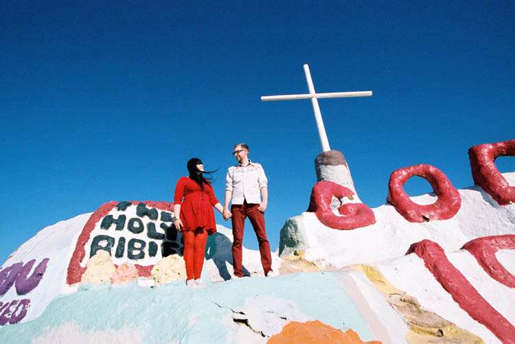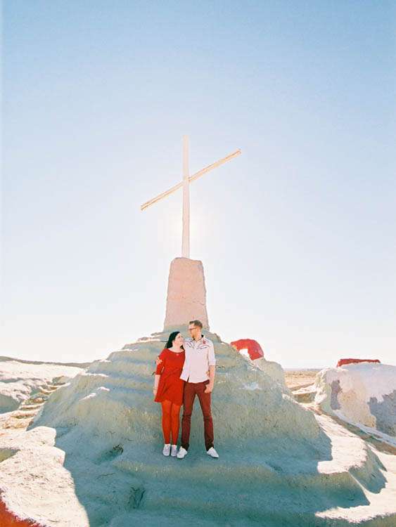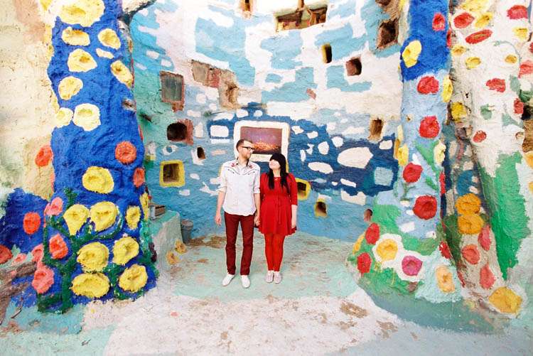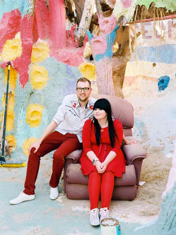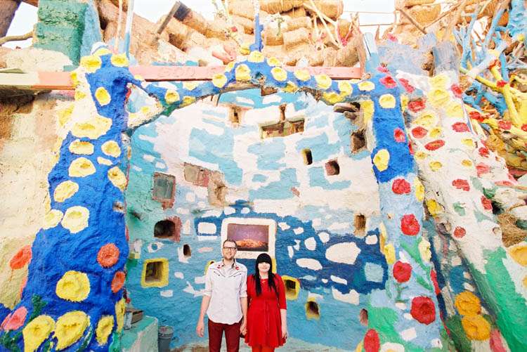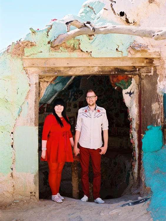 I am seriously so in love with Laura & Colin. What an utterly gorgeous pair, with an utterly gorgeous e-sesh (although these shots were actually taken the day after their wedding) at Salvation Mountain. I’ve blogged about this amazing place before. The ‘mountain’ in the Californian desert is a 50 foot mountain, made totally of local adobe clay and paint. The 79 year old creator of this national treasure, Leonard, lives on site alone in his truck (!) and his piece of art has been a work in progress for over 20 years!