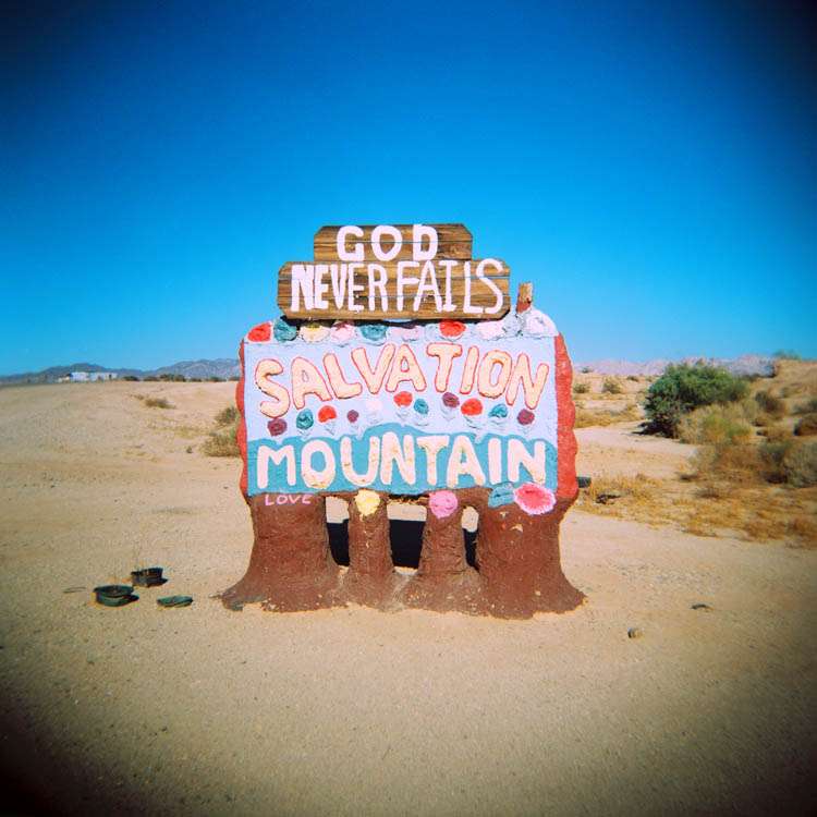 “Salvation Mountain is located in the lower desert of Southern California in Imperial County just east of the Salton Sea and about a hour and a half from Palm Springs,” the mountain’s website explains. “Salvation Mountain is Leonard’s tribute to God and his gift to the world with its simple yet powerful message: “God Is Love.” Leonard’s passion has lovingly created this brilliant “outsider art ” masterpiece resplendent with not only biblical and religious scripture such as the Lord’s Prayer, John 3:16, and the Sinner’s Prayer, but also including flowers, trees, waterfalls, suns, bluebirds, and many other fascinating and colorful objects. Salvation Mountain must be seen to be fully appreciated as those who have made the journey will attest. Its 50 foot height and 150 foot breadth is made totally of local adobe clay and donated paint and is truly unique in the United States and probably the world. From its Sea of Galilee at the bottom, to the big red heart in the middle, to the cross at the very top, the reoccurring theme of “Love” is everywhere at Salvation Mountain”