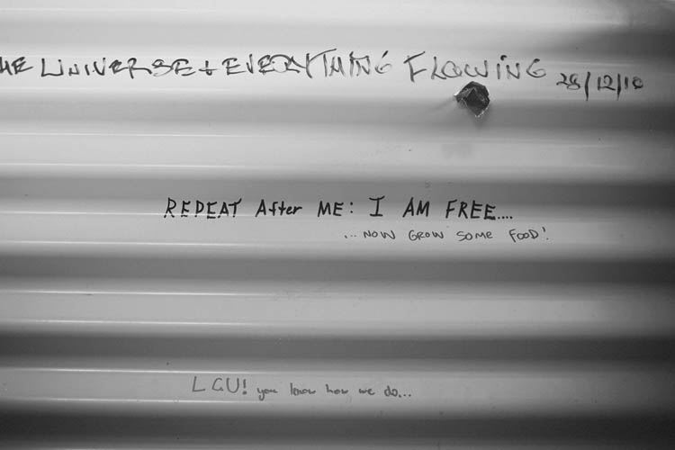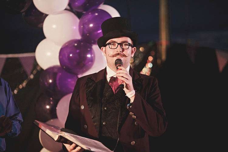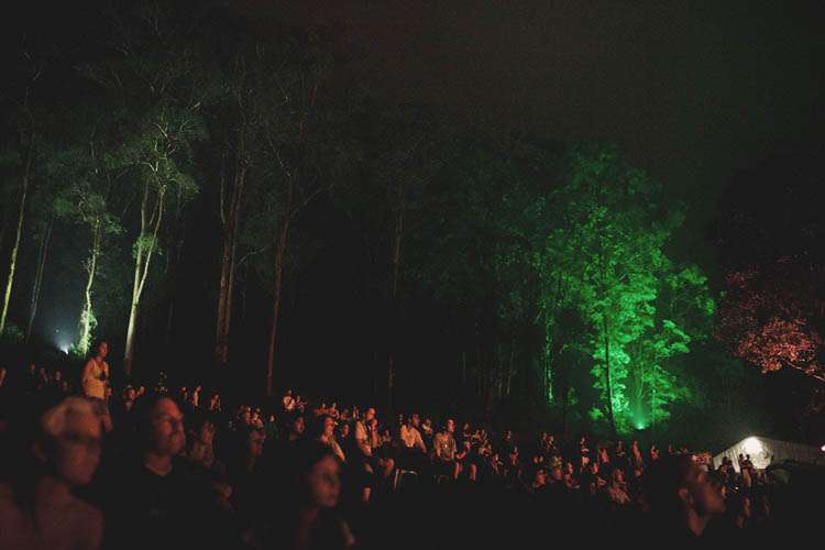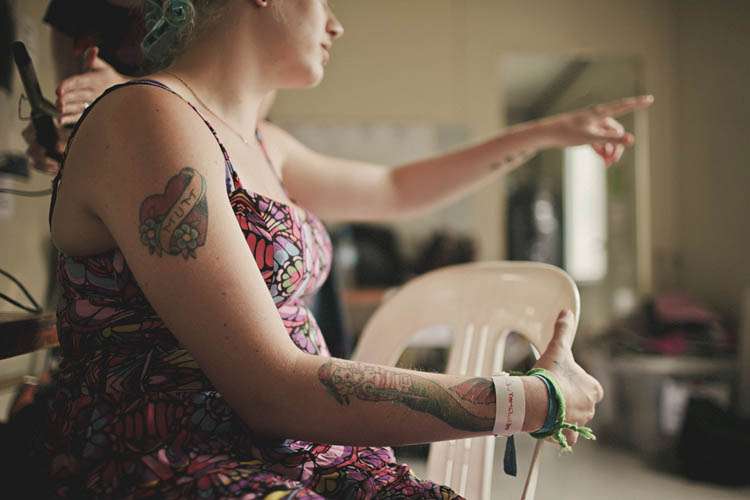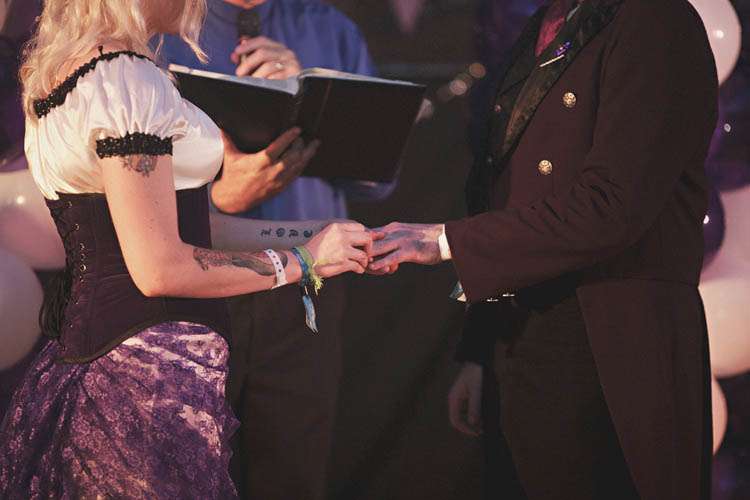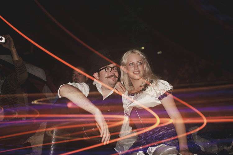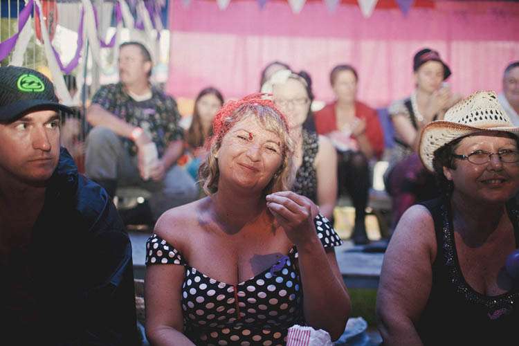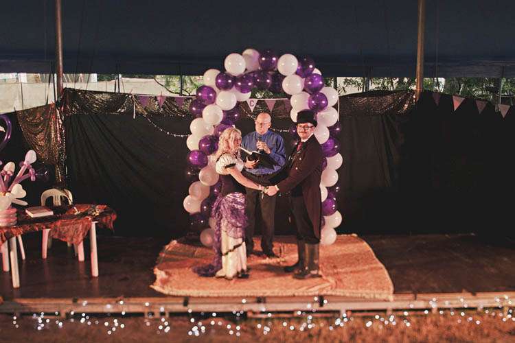 The bride wore a handmade dress and Wellington boots (festivals are muddy!) and the entire wedding was organized by the ‘Circadia’ team. The couple didn’t have bridesmaids, groomsmen or flowers, but they had a cake organized by Michael’s sisters (and a sweetie table, again organized for them by their family!) Bogan Bingo – a 90’s hair band doing a “bogan” version of Bingo – entertained the guests before the wedding began.
