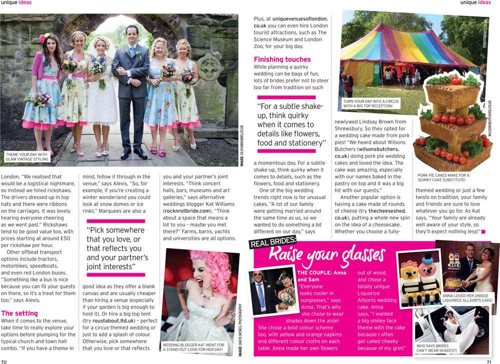 I was contacted to help out with an article on unique wedding ideas. I spoke about some cool venue and reception ideas. They even used a photo of me (to illustrate the wackiness I guess!)