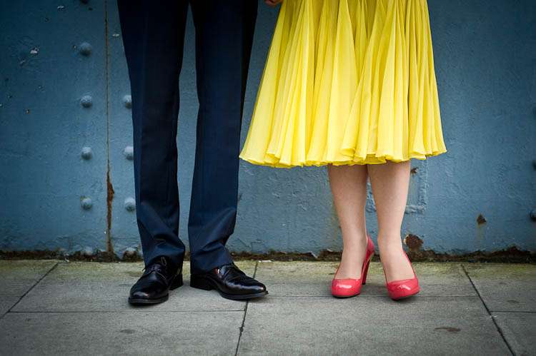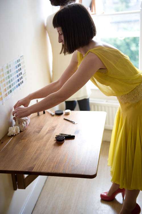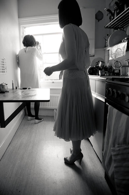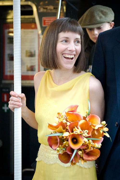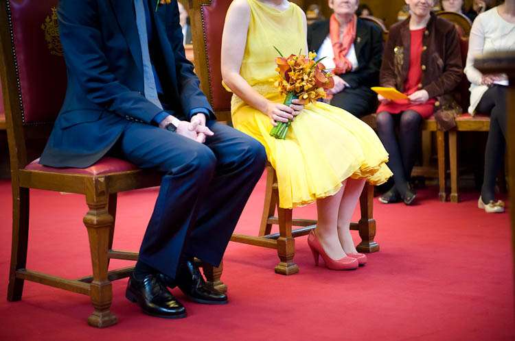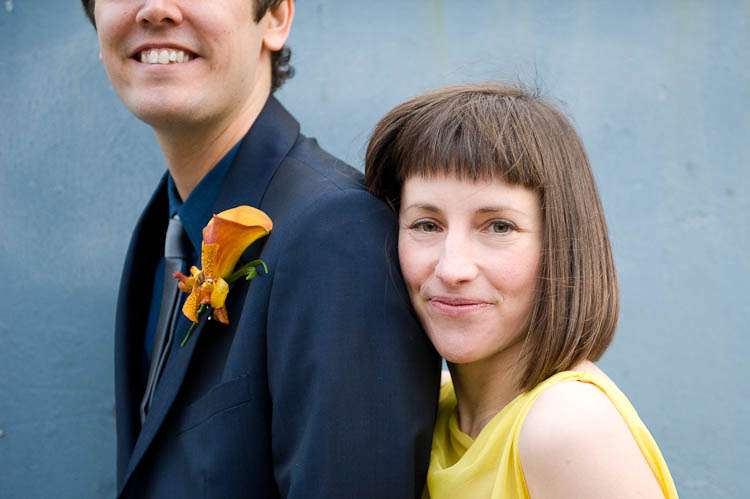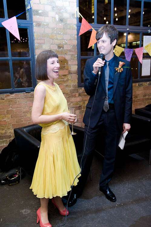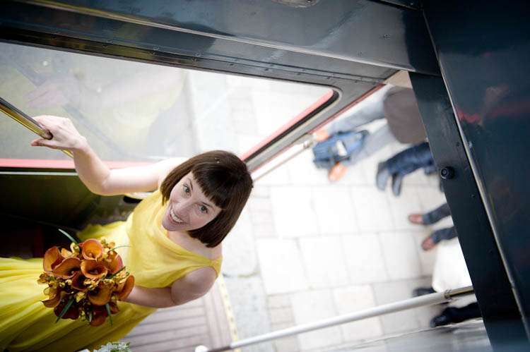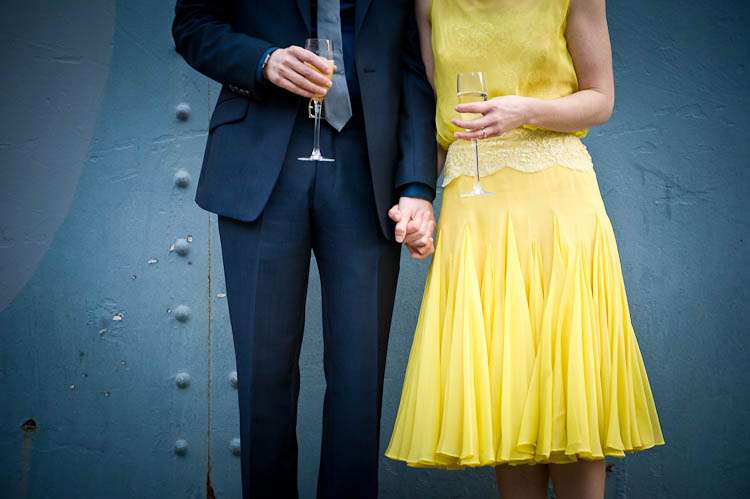 Sally told me all about their day, “My dress was from a vintage fair at Chelsea Town Hall, I don’t know the designer/era but I was talking to a fab lady who runs a vintage shop in Camden Passage and she thought it might be late 50s. I didn’t plan yellow but wanted a bright colour and when I saw it I knew it was what I was looking for. I got it altered by The Lady That Does who is as much fun as she is talented, I spent a good few evenings laughing over cups of tea at her house with her partner – they are both very into their vintage and run swing nights in Walthamstow, but that’s another story… oh yes and he runs dance classes! I almost forgot that I was there to get the dress pinned they were so much fun! Shoes were unimaginatively from Topshop.”