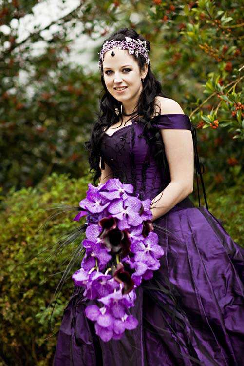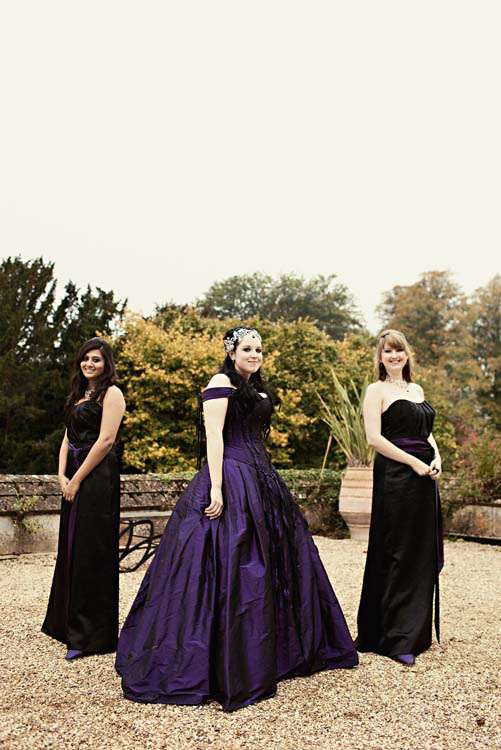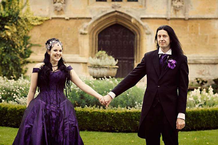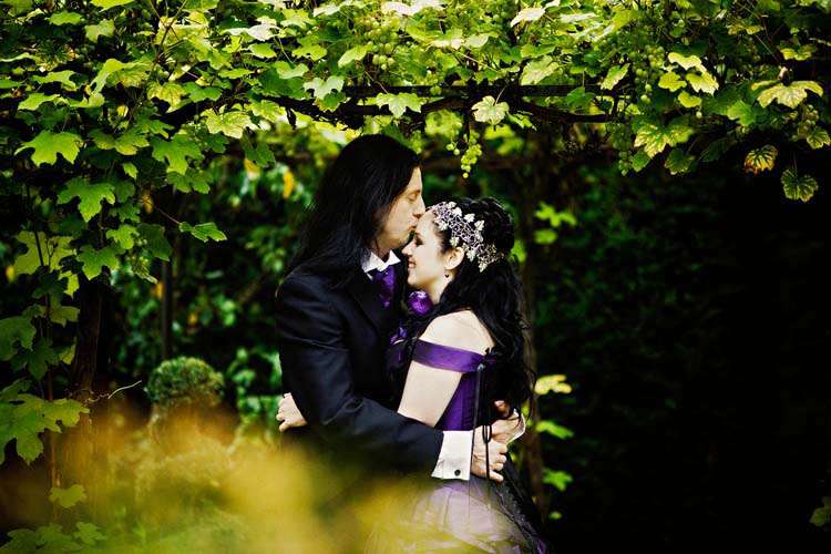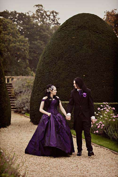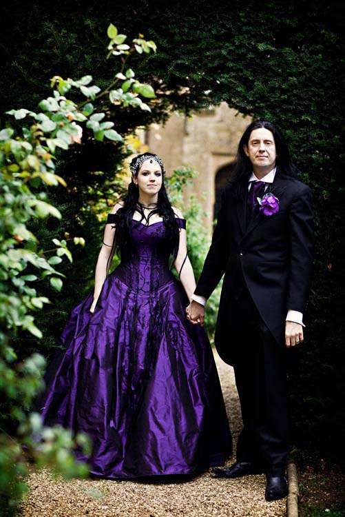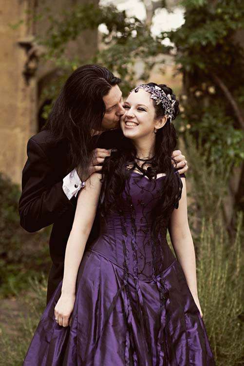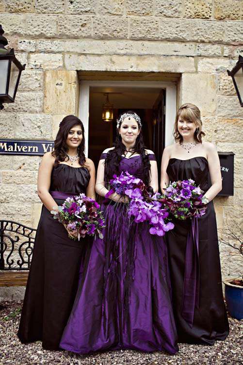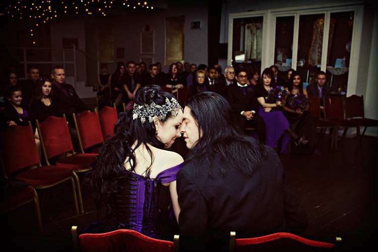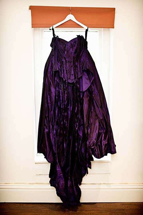 Victor & Tori’s dramatic, slightly gothic – totally fabulous British wedding totally hits the nail on the Rock n Roll head. As soon as these landed on my desk I was instantly smitten with Tori’s wicked deep purple, handmade gown by Janice Whitehorn of Uptight Clothing, “My bridesmaid sent me the link to Janice’s website and I loved her styles,” explained Tori. “I went for a consultation and I told Janice what I liked and didn’t like, and she came up with the most amazing dress/corset that made me feel like a princess, along with the headpiece which was modified from her original design and all the jewellery.”