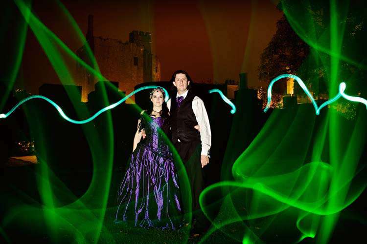 “We always knew our wedding was going to be different – neither of us have worn white since our teens so we knew there’d never be a white dress” concluded the bride. “We wanted a romantic and private setting, and we felt a castle would really fit this idea. We always knew we’d end up having a friend DJ so there was music at a wedding we actually liked, and we wanted a visual treat to remember, so we asked everyone to wear purple and black to fit in – and it really worked! It wasn’t stressful at all, we had so much help along the way, especially from my mum. We also couldn’t have found better suppliers, all were amazing.”