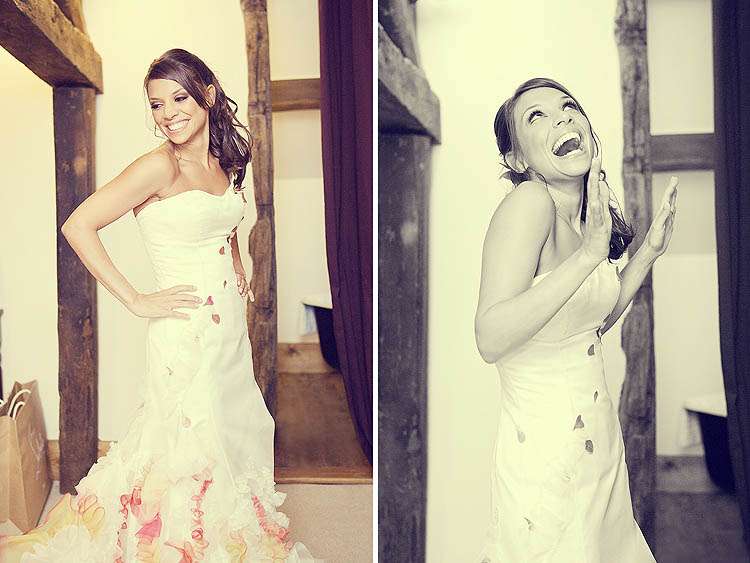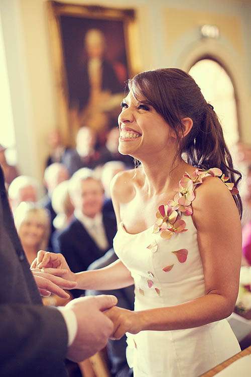 Emmaline’s wedding dress was created by Sarah Treble. She wore this with Christian Louboutin shoes and A Handmade silk hydrangea flower hairpiece to match those on the wedding dress created by Bailey Tomlin. ” The dress really was one of the most important things to me when I thought about the big day – I always had a vision of what I wanted. I spent a year ripping out pictures from catwalk shows and fashion magazines and eventually found Sarah Treble. After our first meeting I was convinced she could bring my dream to life. We then realised Sarah would be moving to Devon, a 7 hour round trip from London which would make fittings trickier than usual, but I just couldn’t imagine anyone else being able to help.”