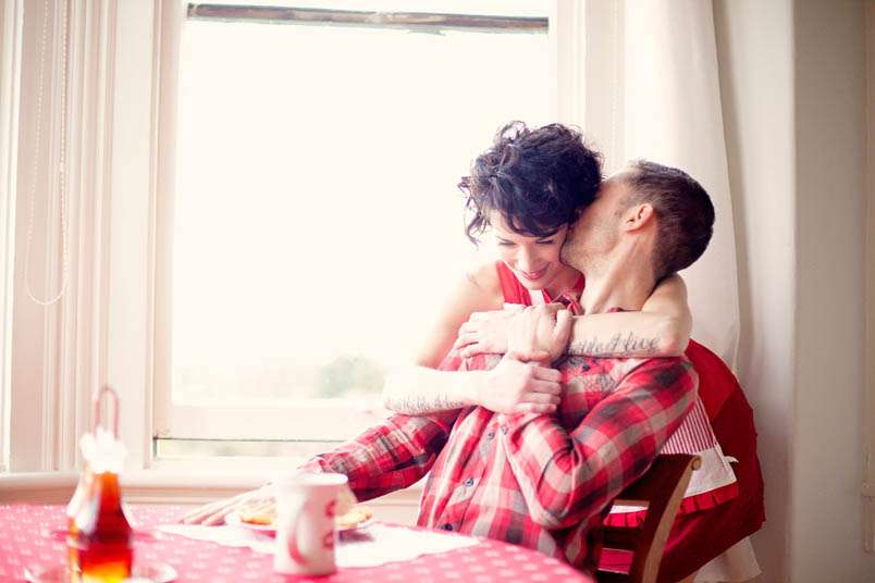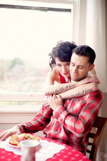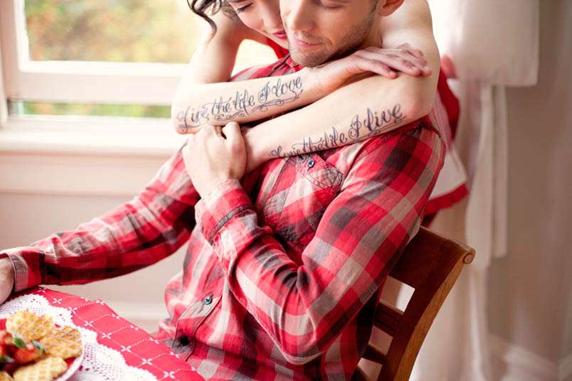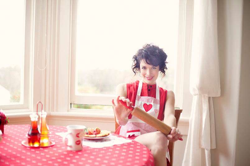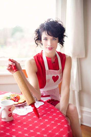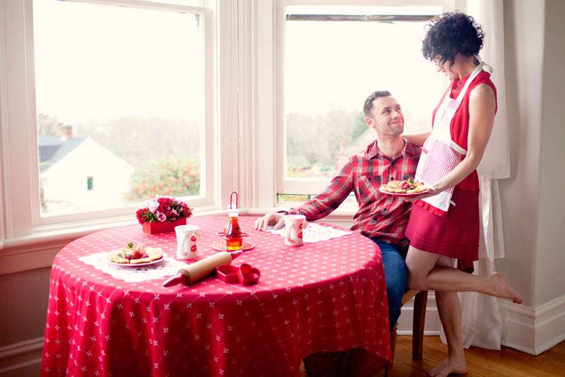 “The original idea behind this shoot was to showcase that it really is ‘the thought that counts’ when it come to great Valentine’s Day gifts,” explained stylist Erica of Rook & Rose Floral Design Boutique.”A home-cooked breakfast (like heart shaped waffles), personalized details (like DIY tea bag messages) and a saucy/cute apron is really all a guy could ever want….”