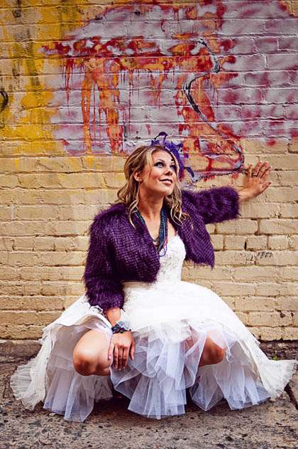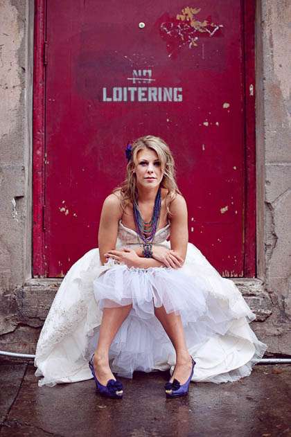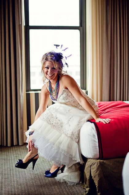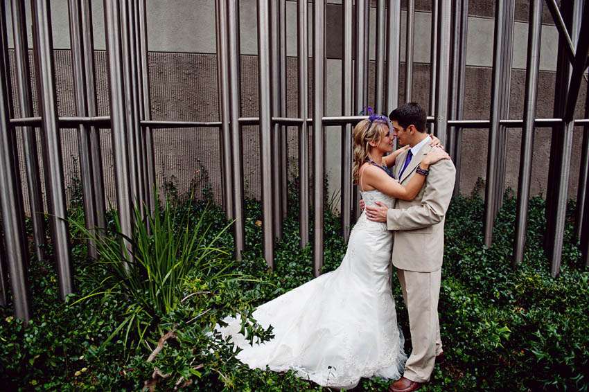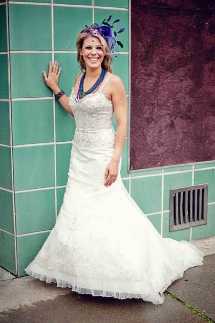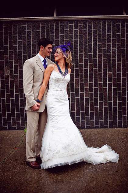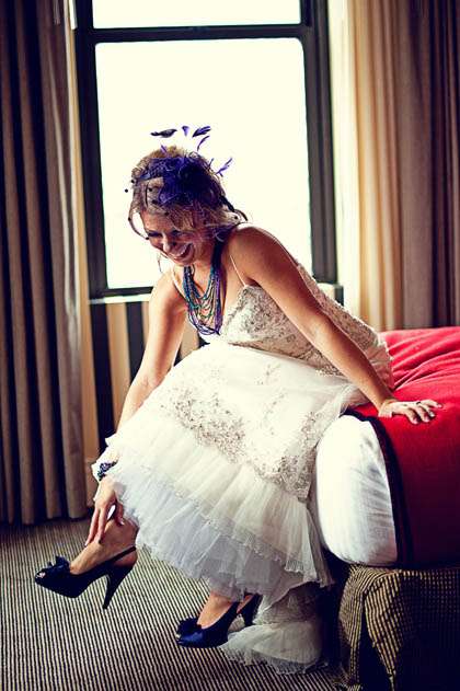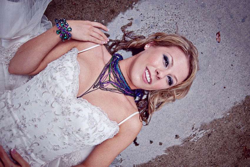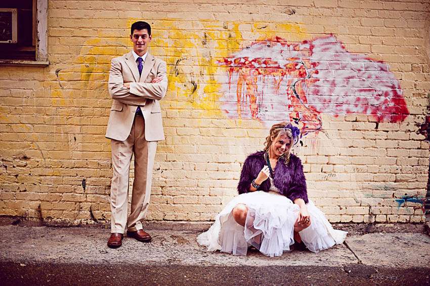 “We were able to get pictures of Lori’s Mom helping her get dressed (something she missed out on doing at the actual wedding because she was busy setting up the ceremony space.) We then braved the cold and rain and rocked out an incredible portrait session of this beautiful couple. We ended things under the freeway with Lori lying next to a drainage grate. It was perfect!”