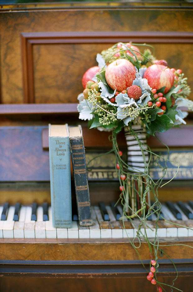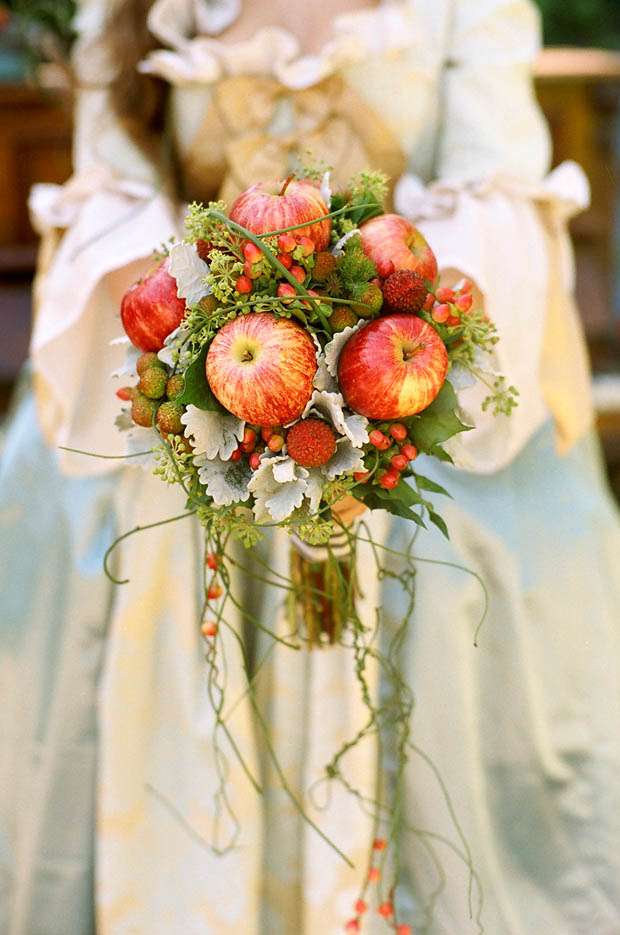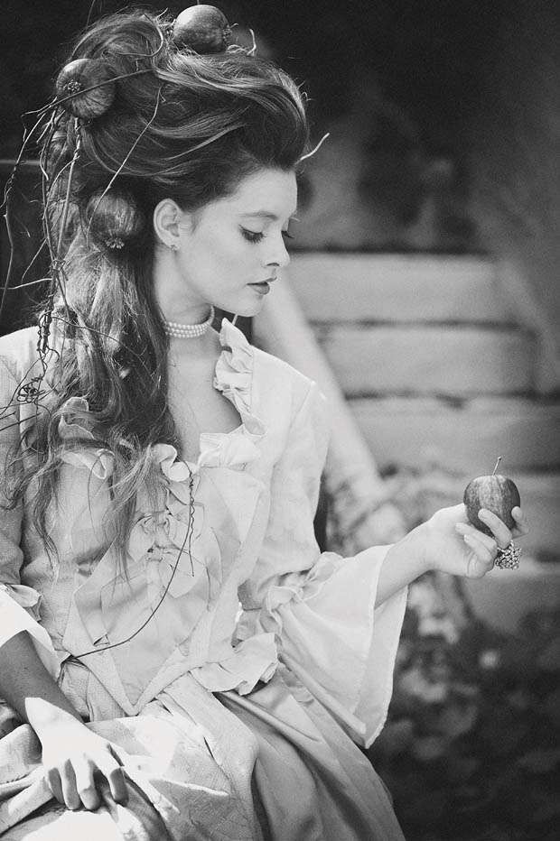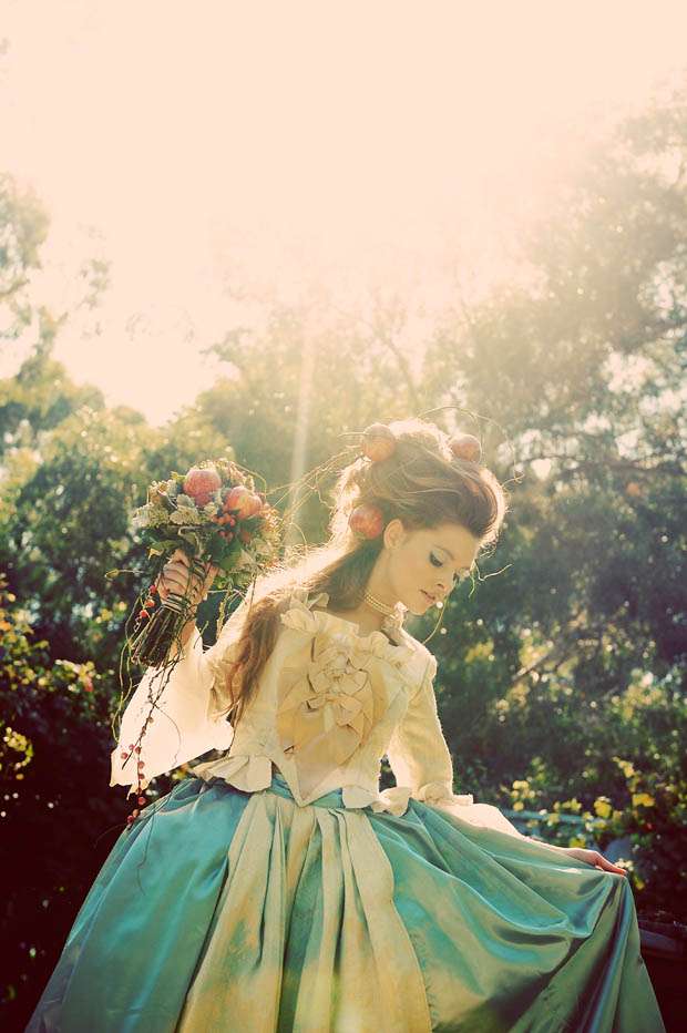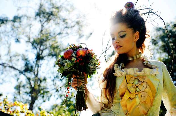 “This is what happened when 2 crazy photographers from different states in Australia put their heads together,” began photographer Vanessa. “It all started with a wig Rhondda found on the internet (not the 1 we used actually) and after many chats and emails later we came up with Marie Antoinette as a bride. I wanted a bouquet out of the norm and didn’t really want traditional flowers in it. What better florists to put my thoughts of an “APPLE” bouquet into something fab..”Velvetlily” florist. So after a talking to them about want I wanted they came up with this amazing result! I also wanted apples and vine in the hair!!..a bit of a task for the make-up artist but we got there in the end.”
