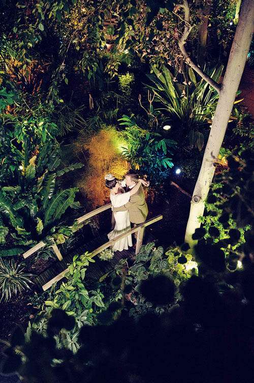 After the service the couple headed further into the palm house for portraits. “We wanted to capture the unique atmosphere of the venue,” photographer Rik told me. “It’s not every day that you feel like you’re in the depths of an exotic jungle in the middle of London! From there we headed out onto the sky walkways around the Barbican to get some cool shots using the strong lines and geometry of the architecture. We loved the blue lighting under one of the walkways and set up a few shots which couldn’t have been more of a contrast from the conservatory.”
