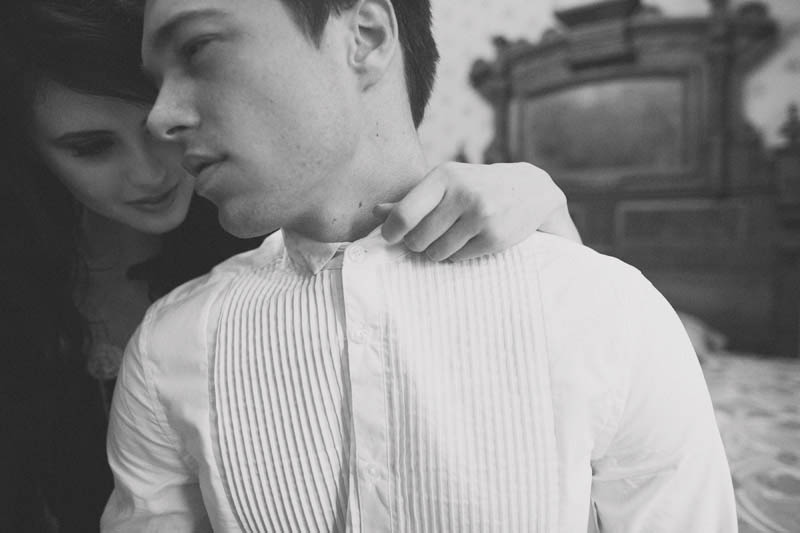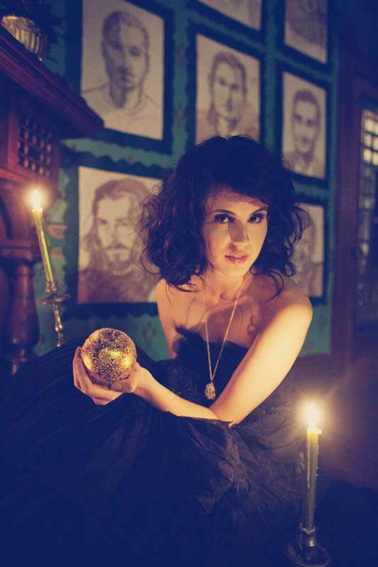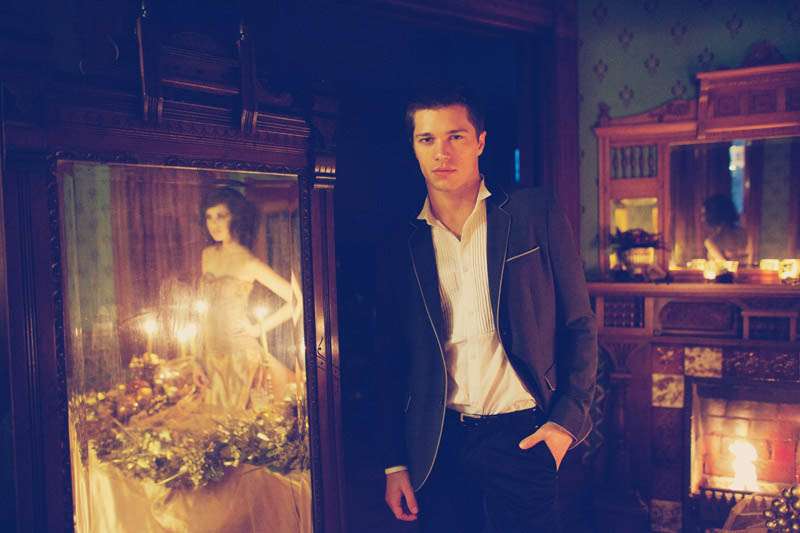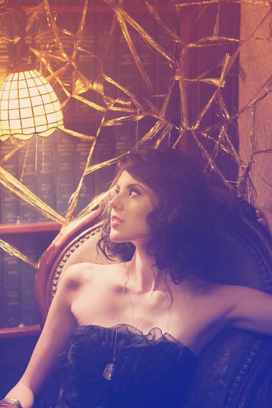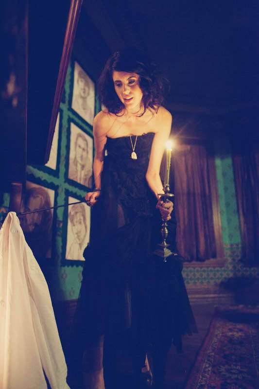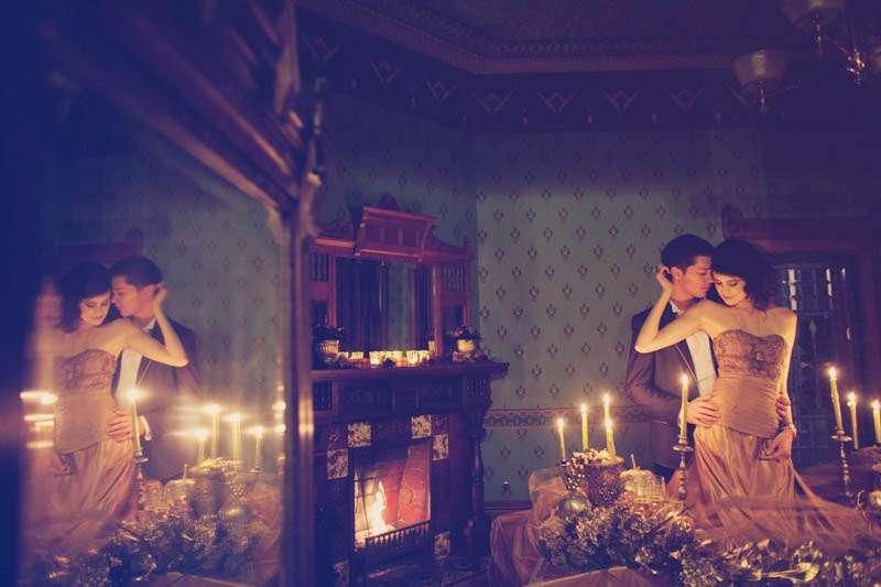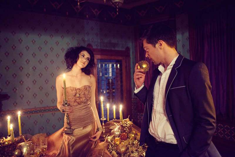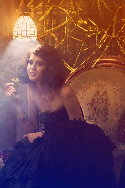 The inspiration they ran with for this session was the Elizabethan period, “A sort of cold, romantic, dark and lethargic feel that illustrates the Elizabethan theater and also the dramatic style of the talented William Shakespeare,” explained stylist Aasim. “Christine Farah and Sugar and Fluff came up with the story of the Widow/Great dame of the manor. It’s a woman who sustains herself by luring men into her house/lair concocting a web of seduction and then having her way with them. She invites her guests to her bedroom where she draws her preys. She then lures them into the dining room where there’s a grand feast on her dress (that’s simultaneously a table) The feast looks too good to be real…enhanced to look golden in the light…but…upon closer inspection…it IS golden!”