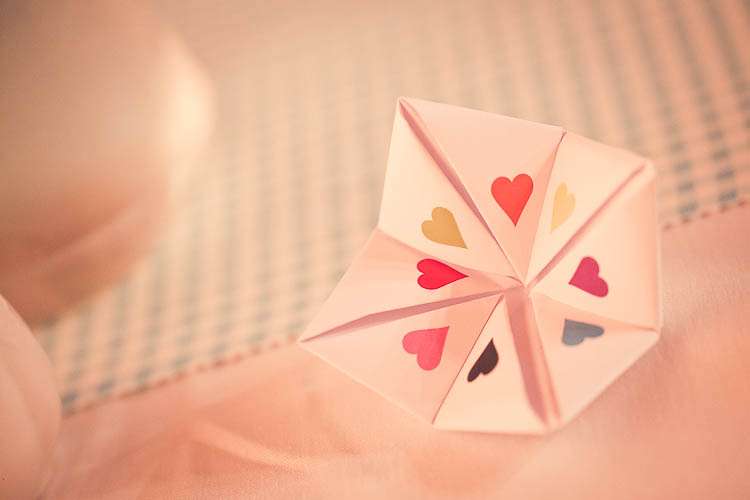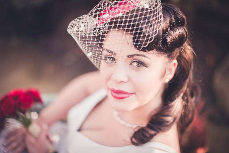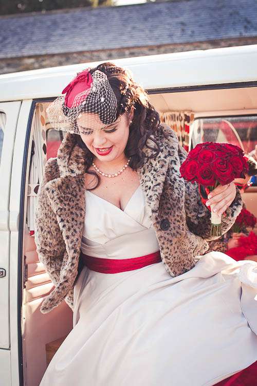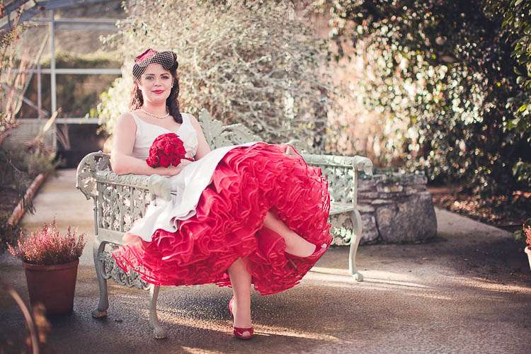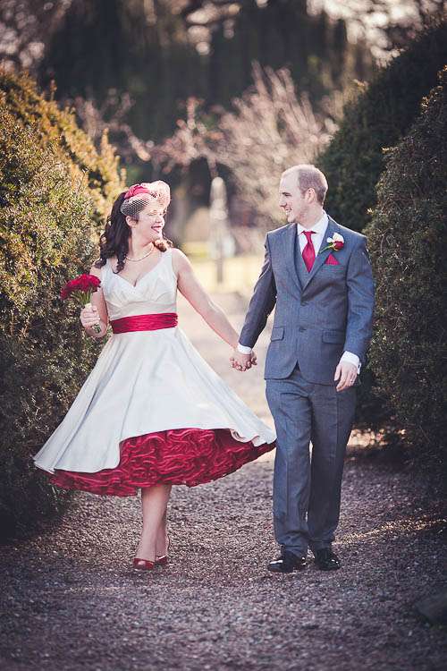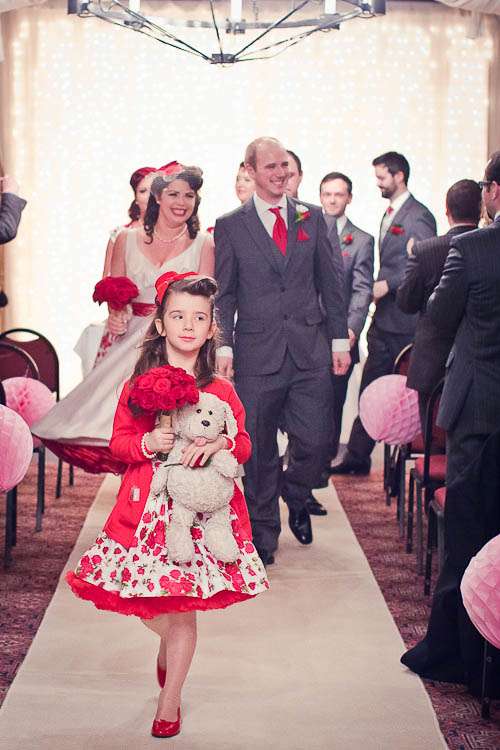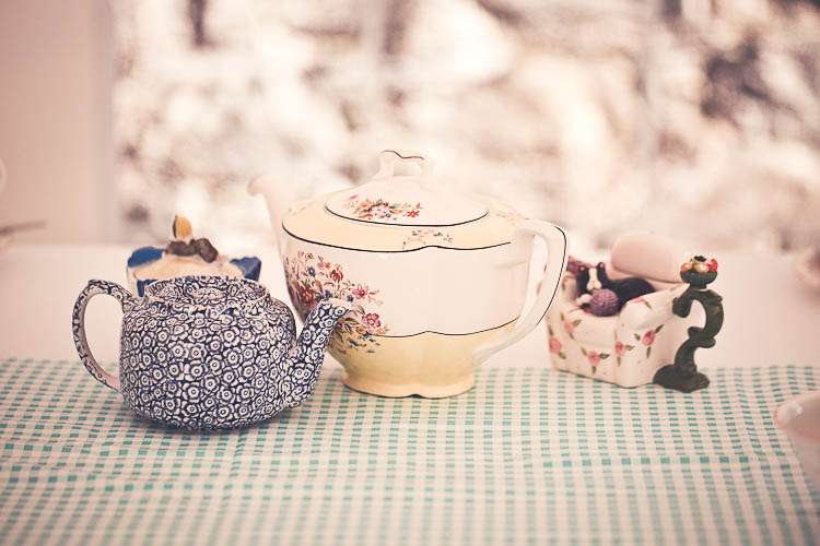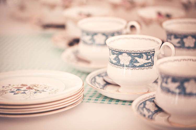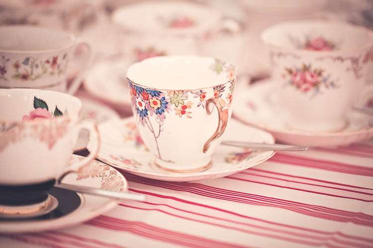 The majority of the reception details and décor were also handmade. The bunting was crafted from paper doilies which Emma bought from a local £1 shop, cut into triangles and sprayed gold. They were then stapled onto red and white polka dot and gingham ribbons and were used to decorate the entrance marquee where the afternoon tea party took place. The seating plans were mad from Ikea frames, the table cloths and napkins were cut from fabric purchased very cheaply and the centrepieces were recycled tin cans that Emma knitted little jackets for (omg seriously dying over how cute these are!) Lily then made lots of little button and beaded hearts which they decorated the woolly jackets with.