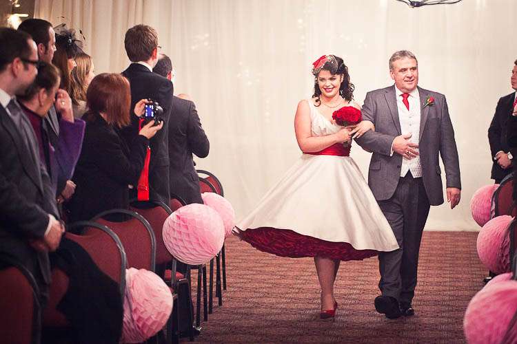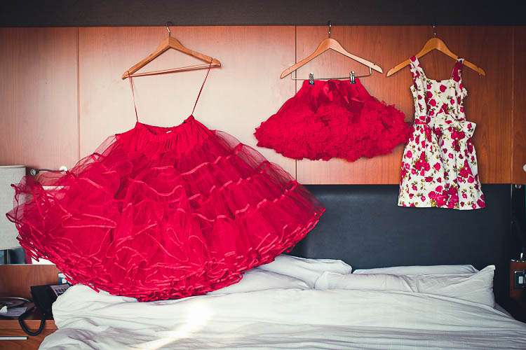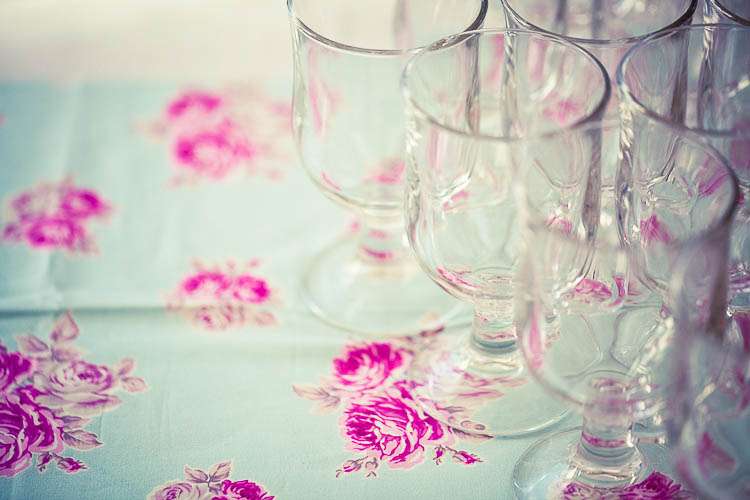 Also on the table was vintage mismatched crockery and table numbers made from bottles that Emma and her Mum collected in the run up to the wedding. They were filled with homemade schnapps! Finally, Emma and Lily made moustaches and lips from Fimo and put them on sticks, “It was a lot of fun and much easier than I thought!” Emma said. “For favours each of our guests got a novelty gift on their chair we had stick on moustaches, masks, false teeth, funny glasses and lots of glow in the dark accessories as we wanted our room filled with laughter and ridiculous behaviour. These were picked up from pound and novelty shops and online.