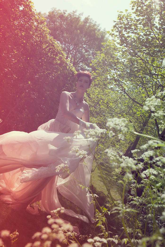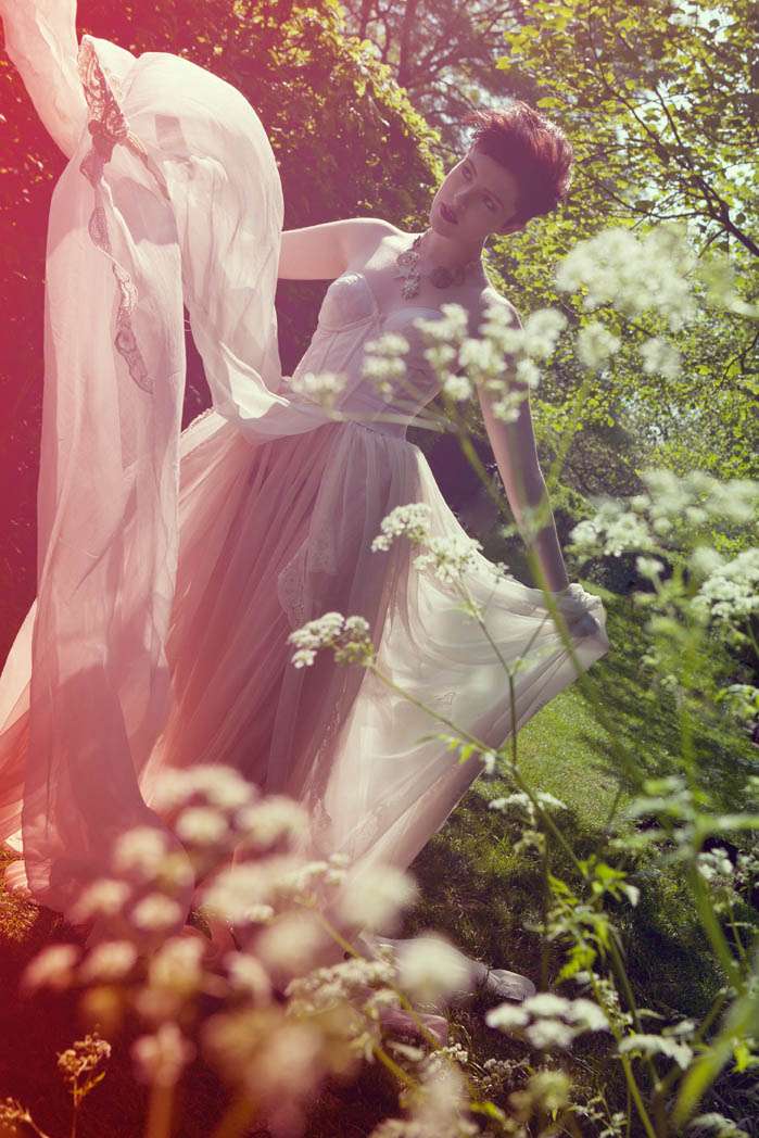The shoot took place in Regent’s Park, London last week. Bride Noelle hand made her vintage-inspired floaty dress. “We decided to do this cherish the dress shoot with a Great British theme, just in time to celebrate the royal wedding,” photographer Rebecca told me. “We also tied in a fairytale them as the royal wedding is set to be a true British fairytale. Noelle also brought along her pet Pug percy for the shoot, who was just adorable and loved rolling around on the British flag.”