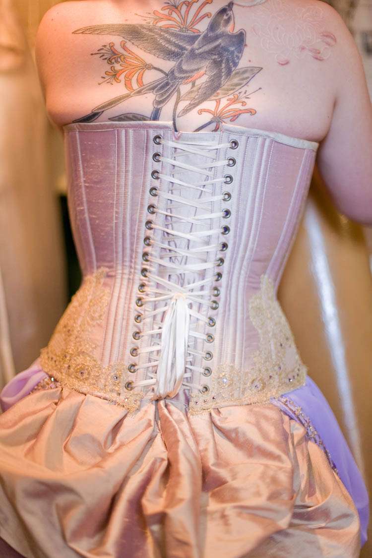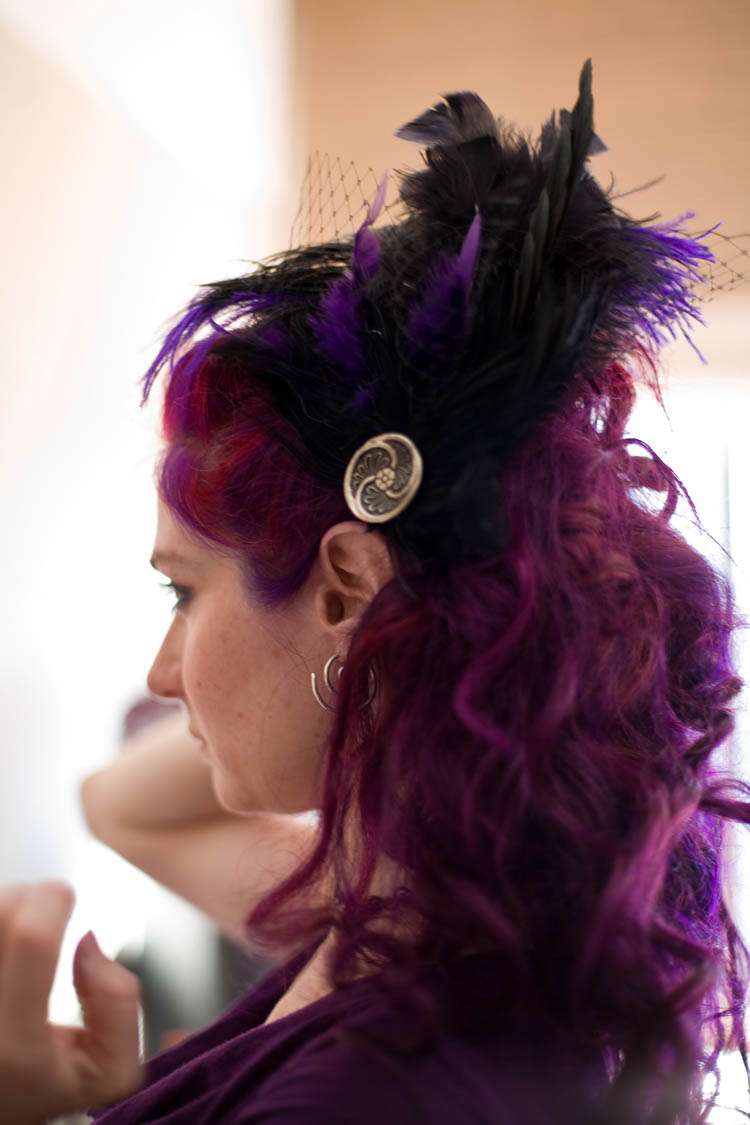 Courtenay wore a custom dress from Dark Garden Corsetry and shoes from Fluevog. “The Dress is a combination of Victorian and Indian influences, made out of silk dupioni in lavender/gold and a wedding sari from an Indian bridal store in Berkeley,” the bride continued. “I knew that a dress from a traditional bridal store was never going to feel right. Mostly because of all the beautiful dresses available at those places they were never going to fit my curvy 5’2” short waist-ed frame. Autumn at Dark Garden was able to perfectly capture and create my personality and vision into an awe inspiring corset and bustle skirted wedding dress.”