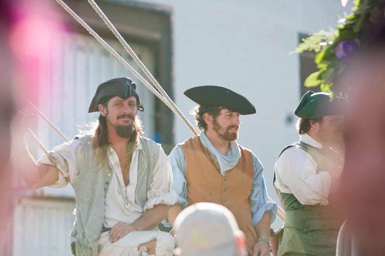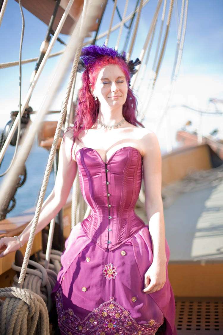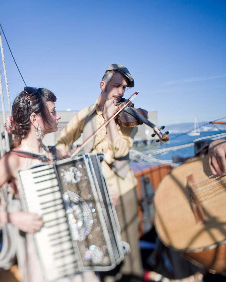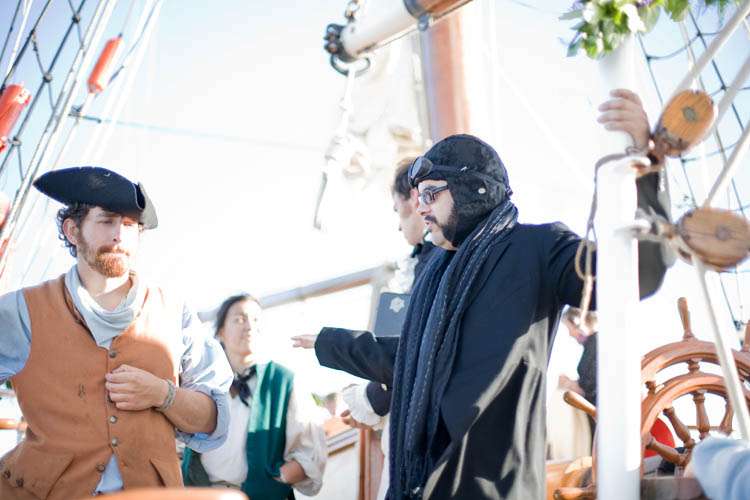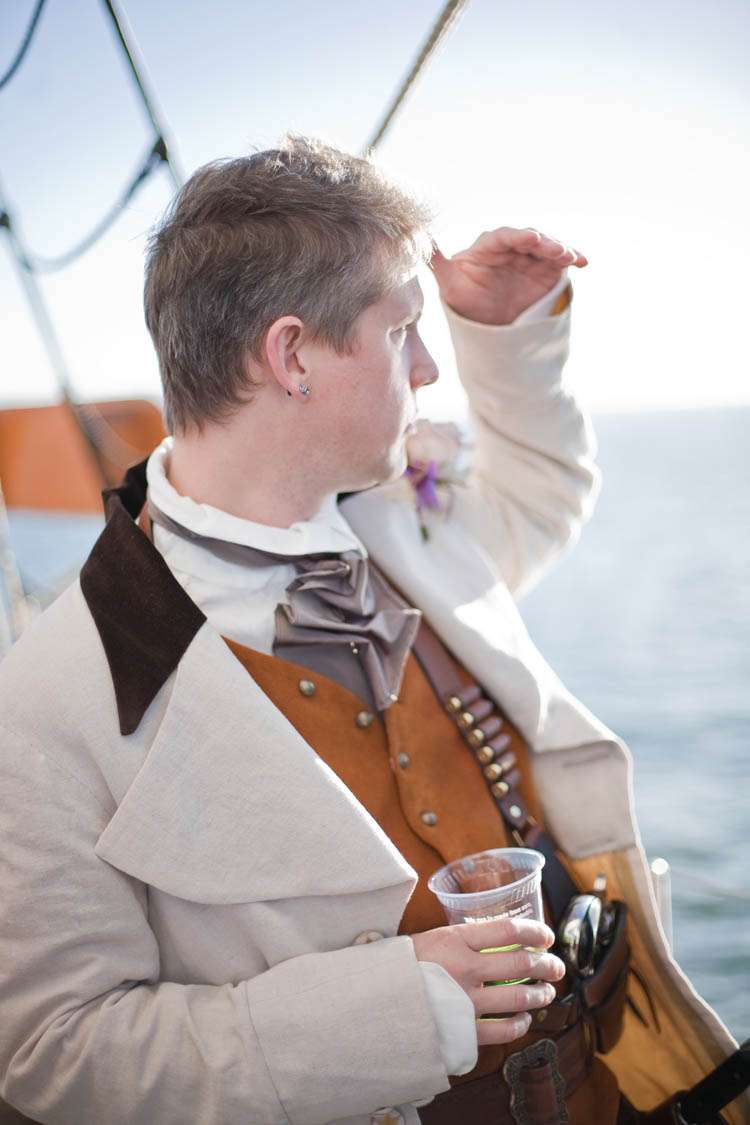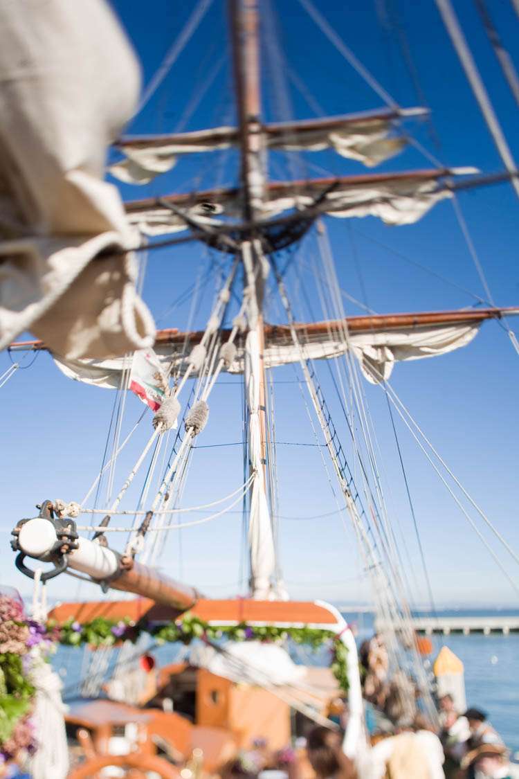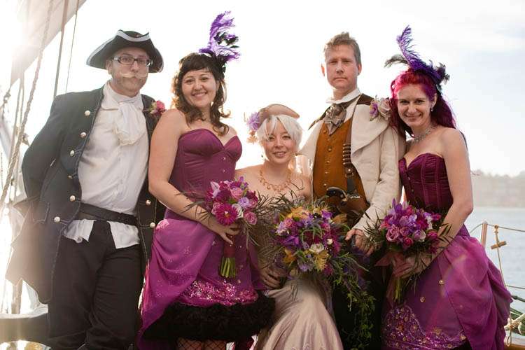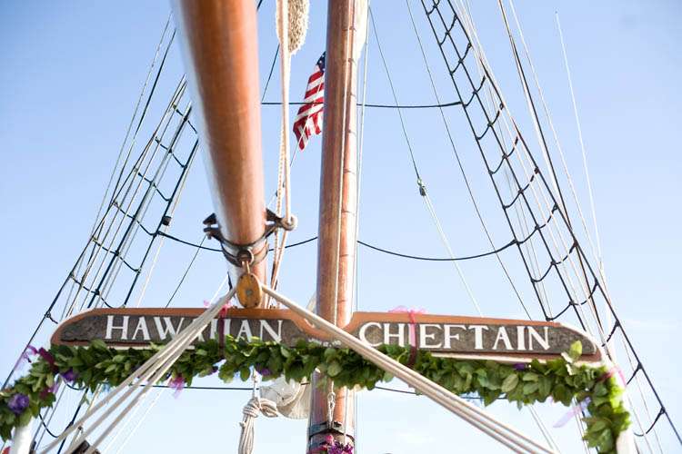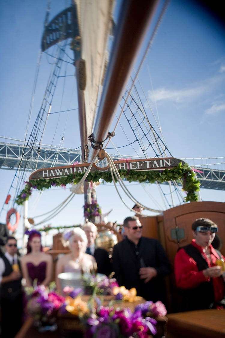 Chris & Courtenay had a “Book Nerd/Steampunk /Pirate/Sci-Fi” themed wedding which was held on The Hawaiian Chieftain, a historical replica of a 1880’s trading ship. “We really wanted the wedding to reflect who we were, and a celebration of what we loved about each other,” the couple told me. “We wanted to be able to have a killer party with our closest friends and family and not compromise our tastes and values. Our venue came complete with cannons (which they fired off for us in celebration!) The double edge of this was a headcount of under 40, which was great to us, but some people just assumed they would be invited who were acquaintances and we had to explain this wasn’t an everyone in the world kind-of affair.”