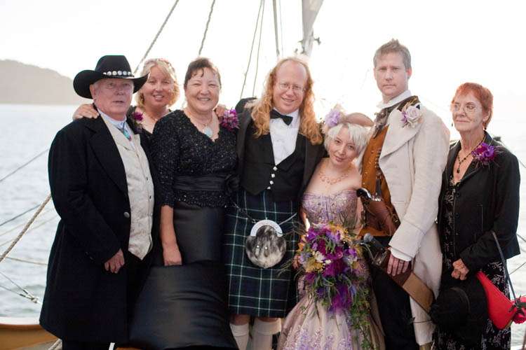 In keeping with their theme, the whole wedding party and a lot of the guests dressed the part too. The groom wore a suit inspired by the movies Firefly and Stardust made by Laurie Tavan at Daze of Laur. He even added a firearm and sword! The bridesmaid’s outfits were also from Dark Garden and the groomsmen wore outfits hired from Costumes on Haight, San Francisco. “Almost everyone who attended got dressed up to the nines and looked fantastic,” Courtenay explained. “My father went out of his way to get a 1890s cowboy style outfit with beaver felt hat and classic oil cloth duster, he was so handsome. My sister got a beautiful Dark Garden corset, and my niece and nephews got into the act with pirate/Victorian style costumes. For the first hour and a half people kept coming up to me just in awe of how beautiful it was that day, mid 70s and sunny, it was truly magical.”