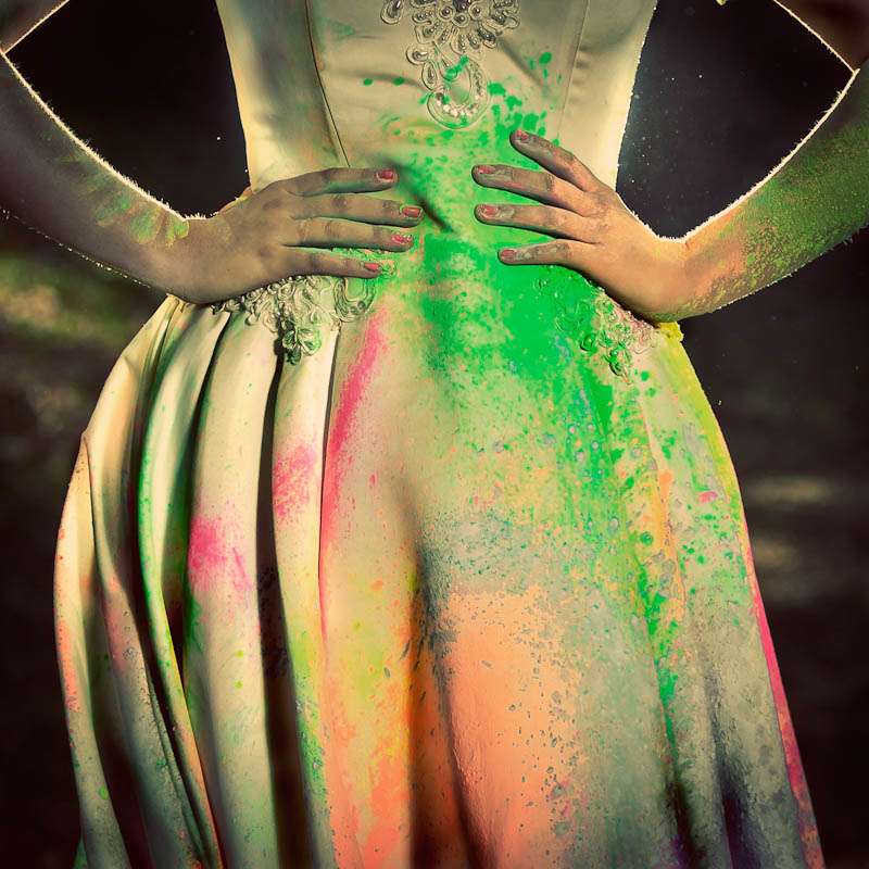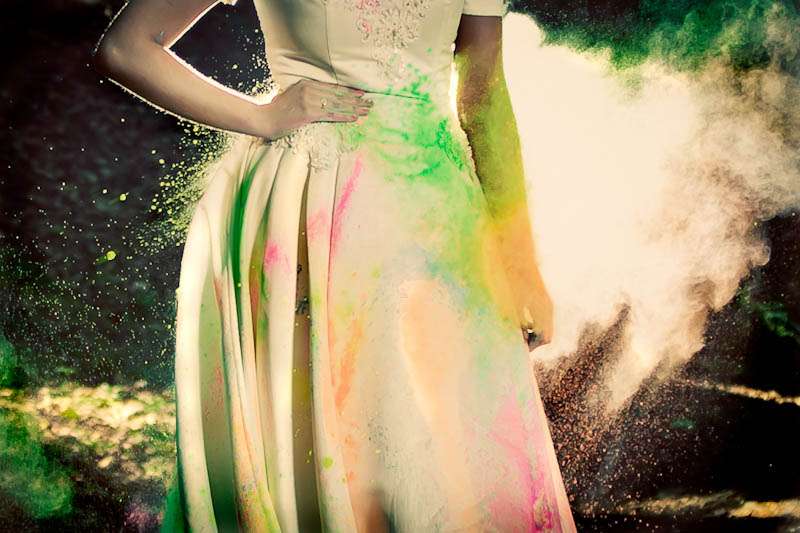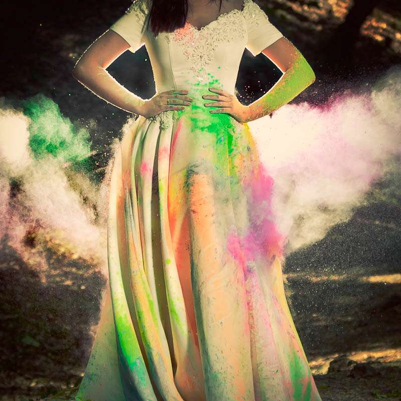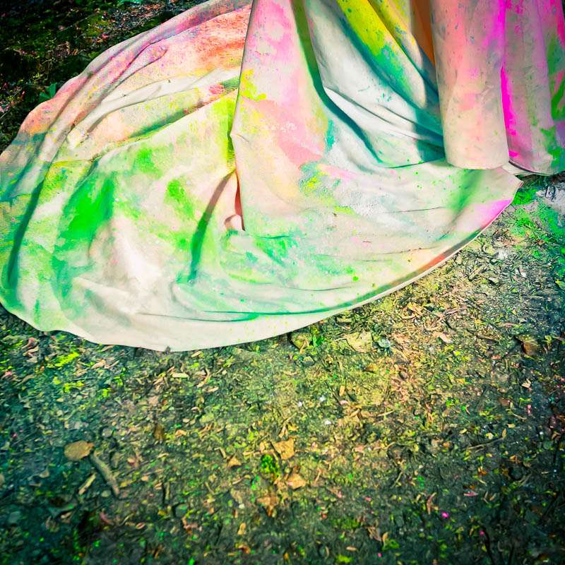 “We wanted it to be fun so packed a picnic, chandelier, flags, bunting, balloons, bubbles, masks, several meters of fabric and threw in a couple of wedding dresses as you do!”
