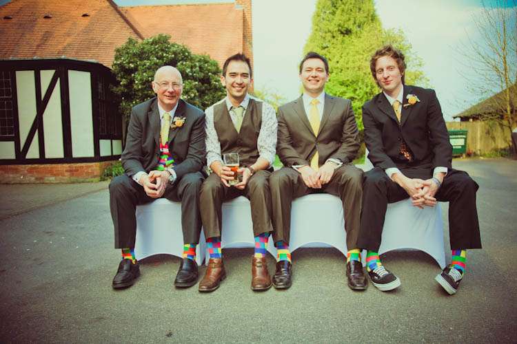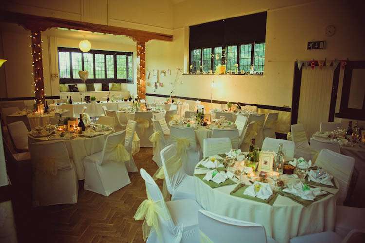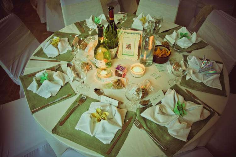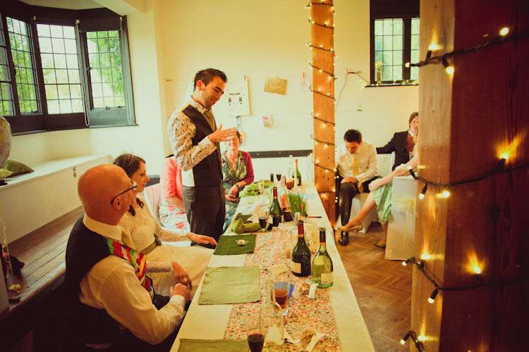 The bride wore a second hand dress which she found in Oxfam, which she customised with some fabric flowers. “My dress was donated by a recently widowed man,” Laura told me. “It had been his wife’s wedding dress many moons ago. I’ve always loved charity shops and so it was only natural for me to find my perfect wedding dress in one too! On the day of our register office ceremony, I walked in the door and the registrar choked on her words. She stood in shock as apparently she had worn something very similar on her wedding day in 1959. Her marriage was still going strong and she wished us as much happiness as she had had. It was a very special moment for both of us. I found a green satin flower sash to go accessorise the dress from ProjectU on Etsy.”