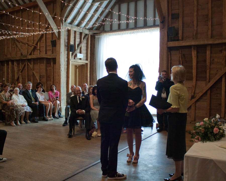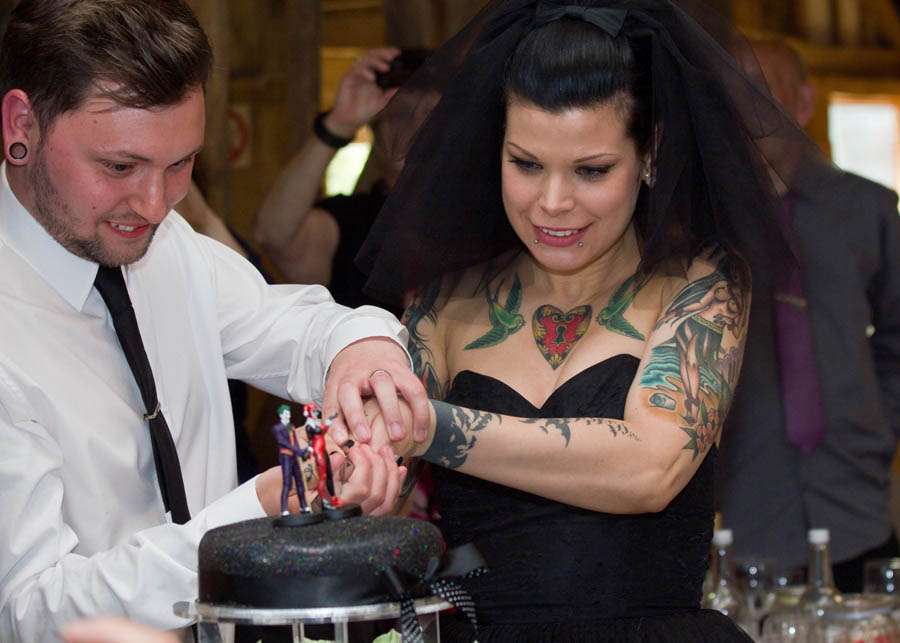 I’ll be honest, I’ve been looking forward to seeing Sarah & Adam’s wedding for an absolute age. You see, I saw Sarah’s incredible black wedding dress many times before the event, when I popped into see my girls at Fur Coat No Knickers in London. Laura & Emma showed the dress to me and told me I’d love the bride that has bought it – that she was cute and tattooed and wearing a black veil to match…and oh boy we’re they right! So without further ado…