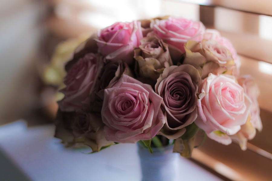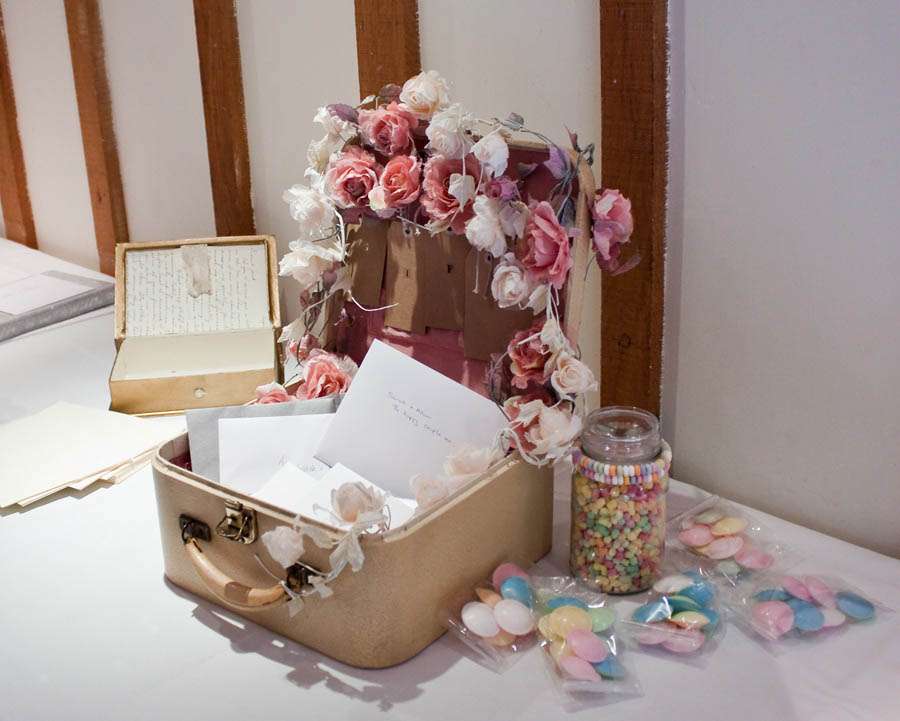 “We did all of the table decorations ourselves, tying ribbon around old jam jars and coffee jars to brighten them up and filling them with colourful sweets. We used blackboard paint and chalk for the table names. We also designed the table plan ourselves. We had empty Coke bottles dotted around the bar with some simple flowers from Camden Market placed in them. I bought an old vanity case from Camden market and wrapped silk flowers and luggage tags to it to use as a gift box.”