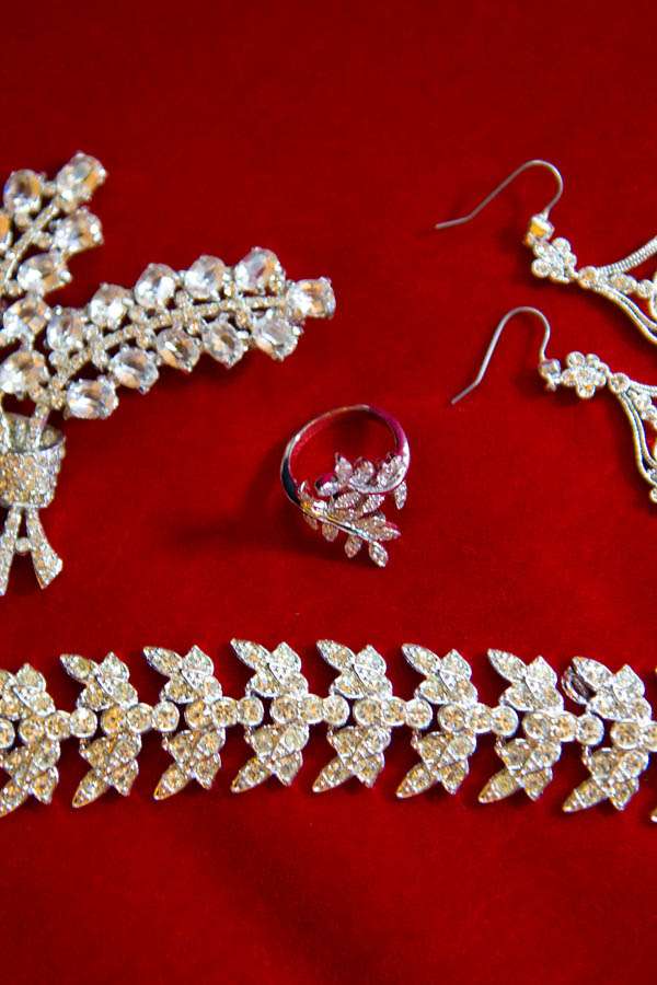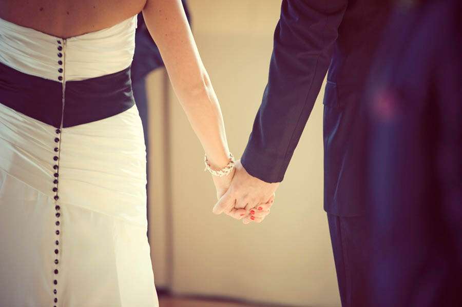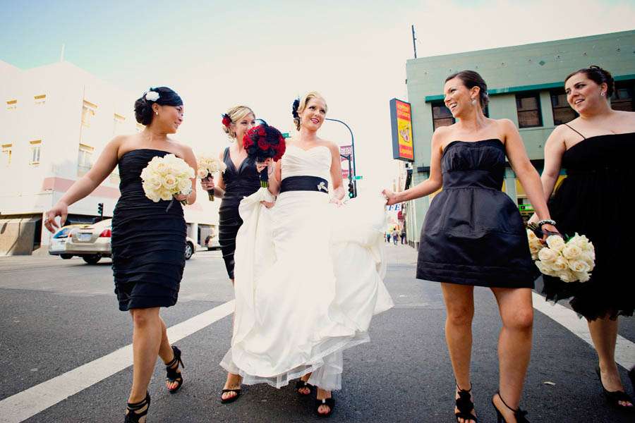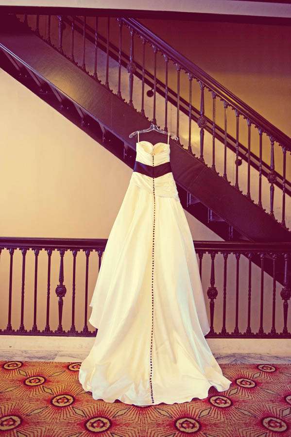 “I had a very specific idea of what I wanted my dress to look like from day one. I knew I would have to customize one. I found a plain dress that I loved the shape of, and then altered it completely to make it my dream dress. I was slightly nervous because I didn’t actually see the final product until 3 days before my wedding. I ordered the dress about 8 sizes too big so they could cut out the back. Originally, it laced up. We added a zipper and then 90 black swarovski crystal buttons all the way down the long train. Originally, the seamstress just wanted to put them halfway down. I said, nope, all the way down, give me some drama! Then we added the black sash and vintage brooch. The look was EXACTLY what I had imagined in my head.”