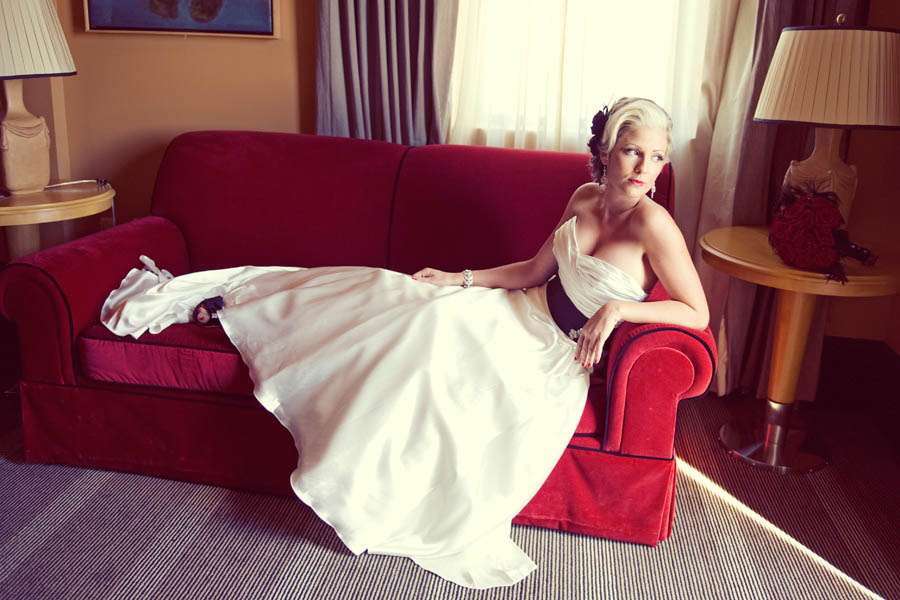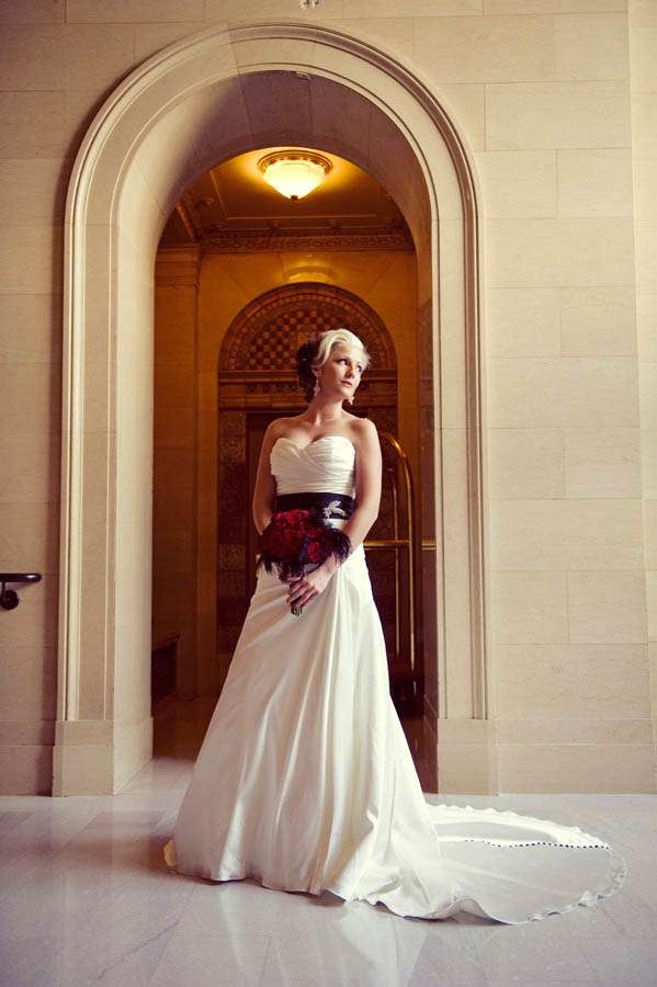 The wedding took place at The Citizen Hotel, Sacramento, a art deco inspired building that also added a lot to the theme of their day. “Our starting point for our theme was our venue. The lobby looks like somewhere the Rat Pack would be hanging out, smoking cigars and drinking martinis. We took this and ran with it. My whole look was 40’s inspired – from my platinum hair, red lips, and vintage jewelry. We kept up that theme for the reception decor, with crystal lamps and dark red roses. The result, although 40’s inspired, was also very timeless and classic.”
