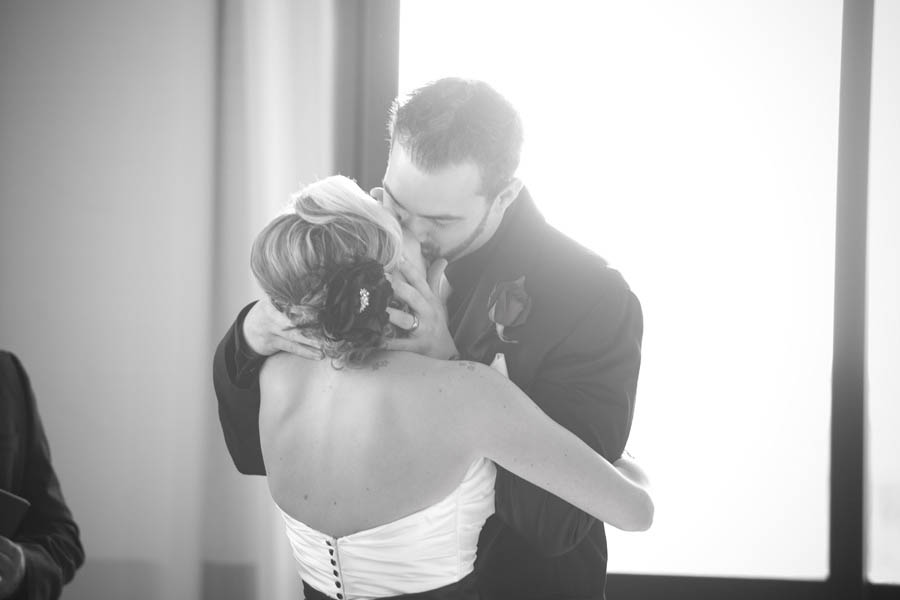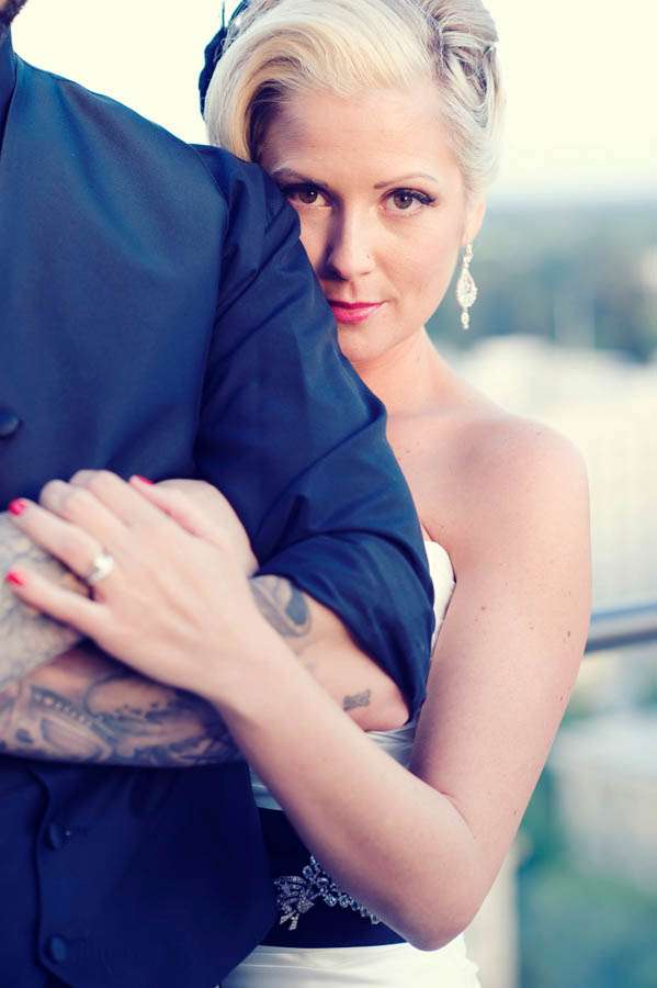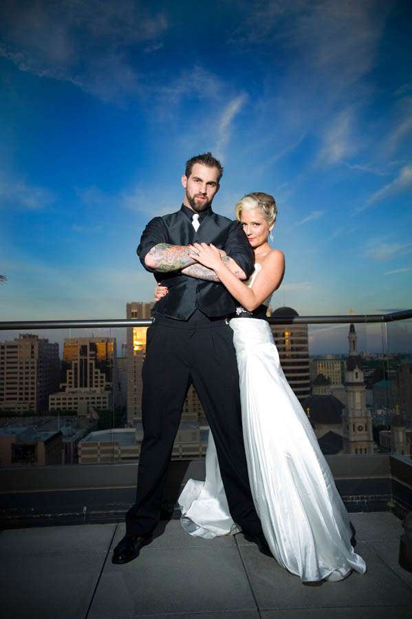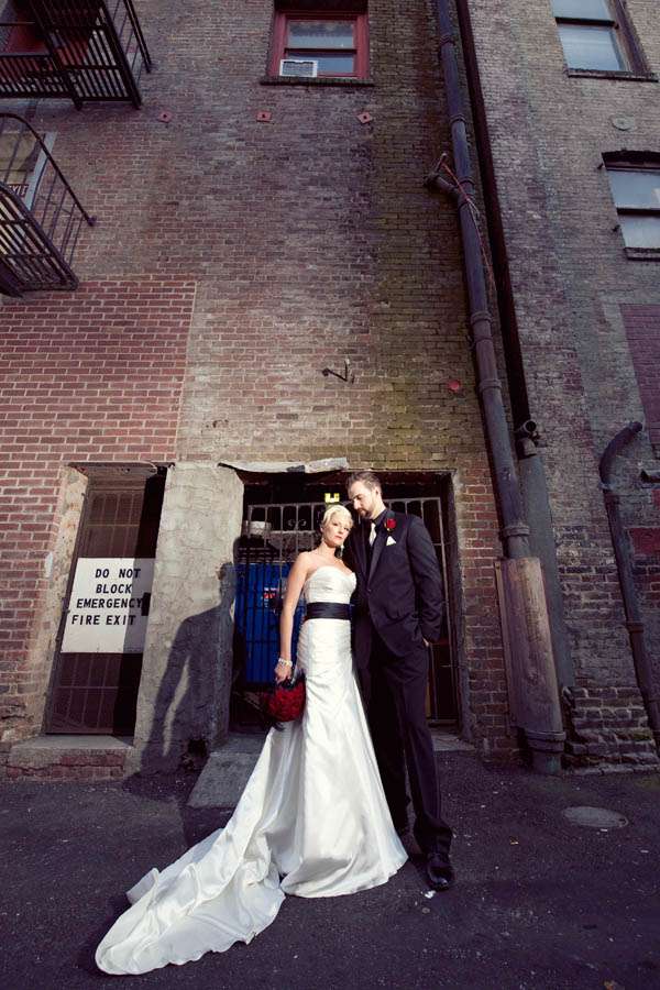 “We wanted our pictures to be city-inspired and a bit gritty. We went back behind alleys and took the most gorgeous pictures on streets lined with dumpsters and grafitti. We wanted edge, and our photographer gave us the most gorgeous, edgy pictures we could have imagined. We also wanted to incorporate rock music where we could, as we are HUGE fans. We cut the cake to Motley Crue and we played string quartet versions of songs by Metallica, Guns n Roses, etc before the ceremony. We wanted people to leave that night thinking that our wedding was “So Brian and Kristin.” I think we accomplished that!”