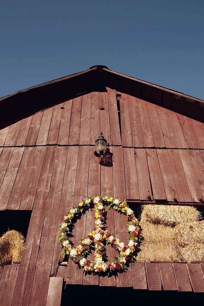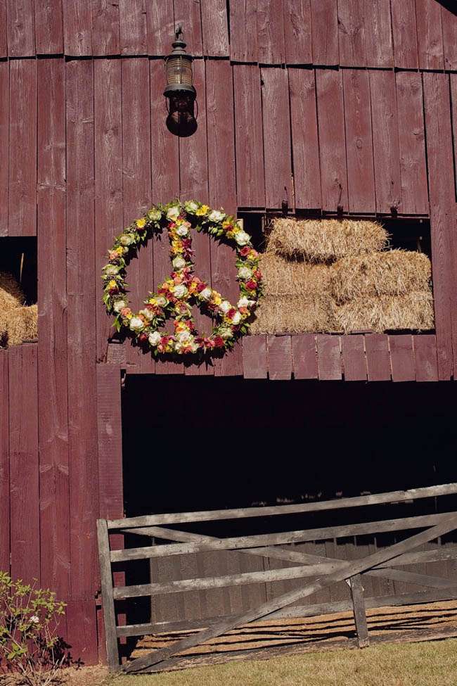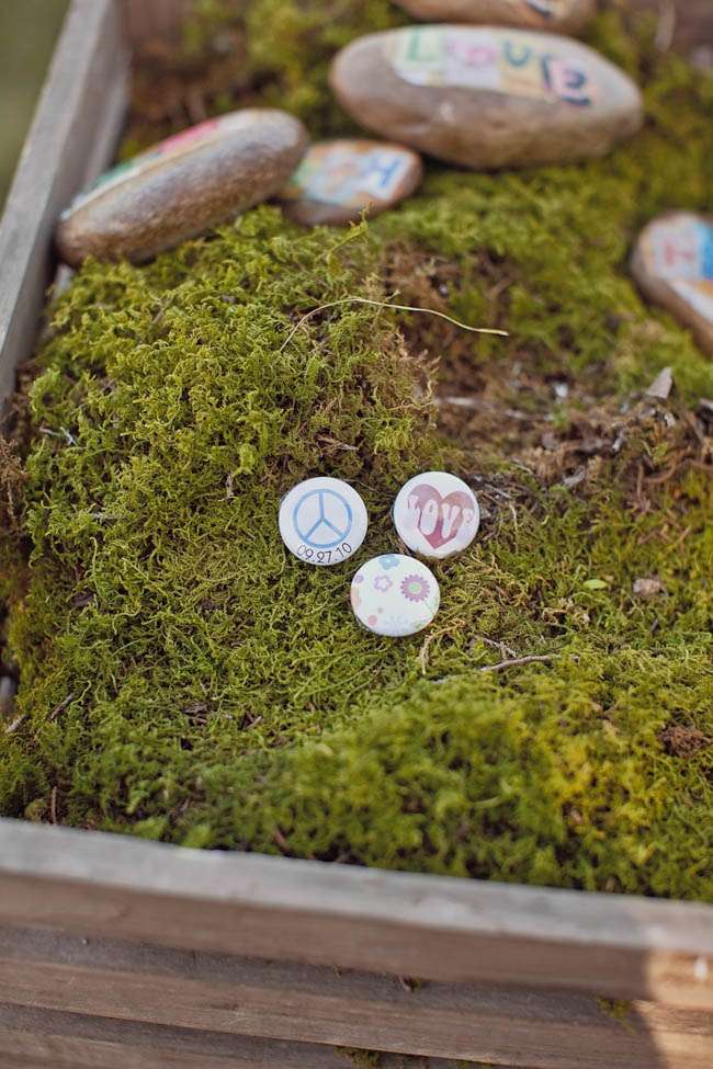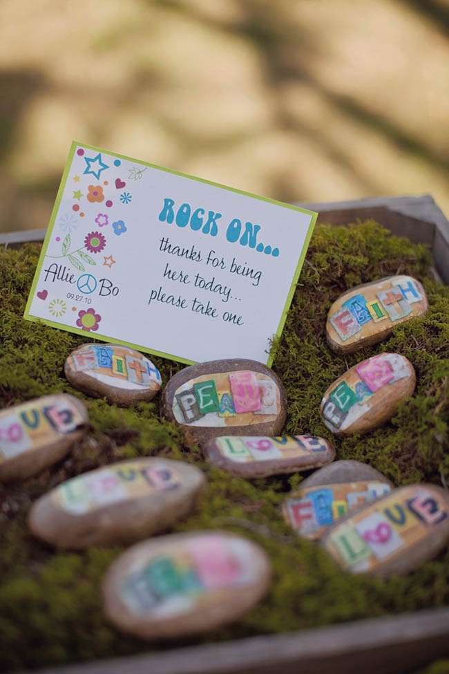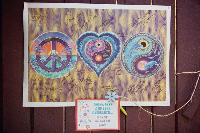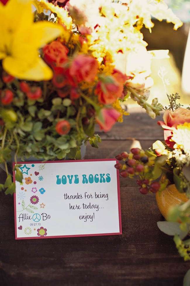 “Also freshly picked field flowers incorporated in my bridal bouquet and unique floral designs (we literally helped pick our flowers right off the property grounds!) and a fun and whimsical icons with a timeless message – like peace signs, vintage posters and ‘love rocks’ favors.”