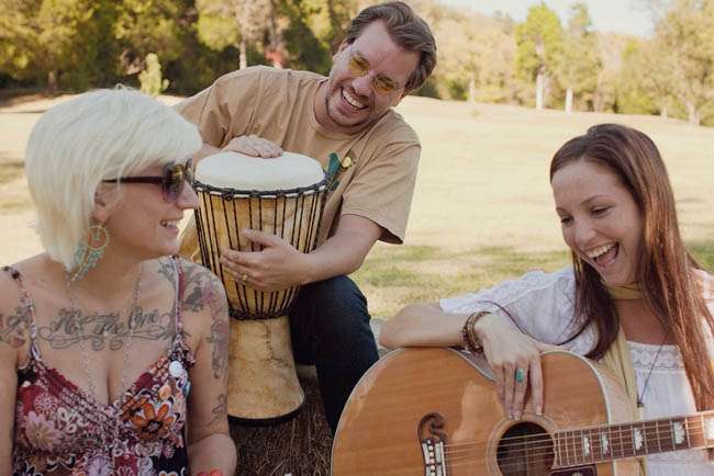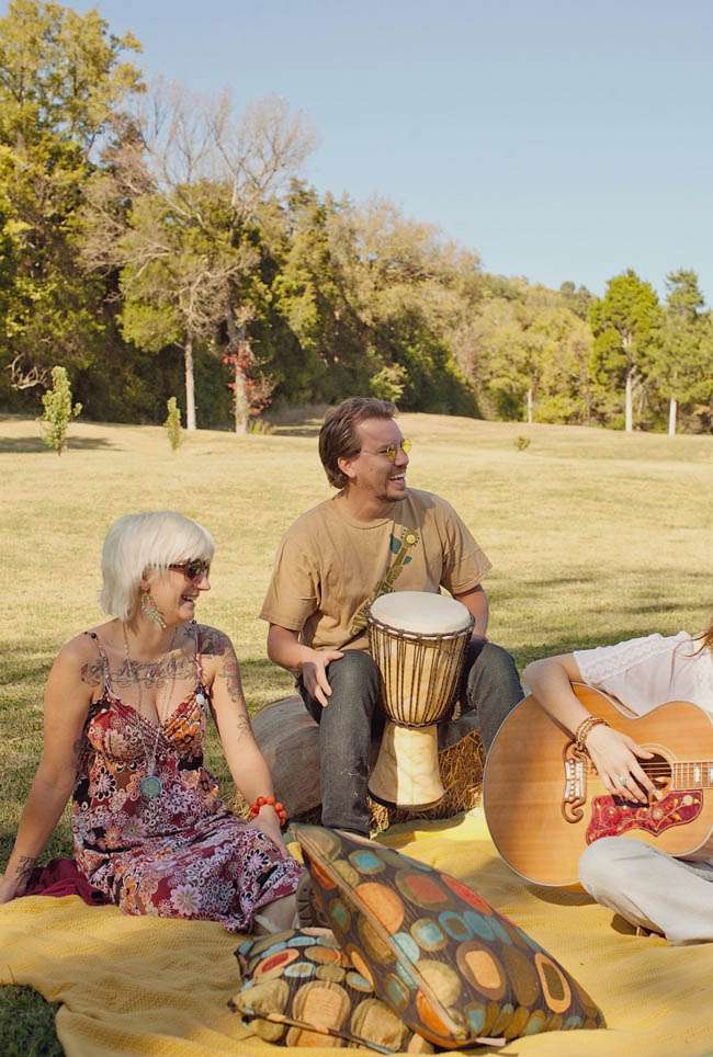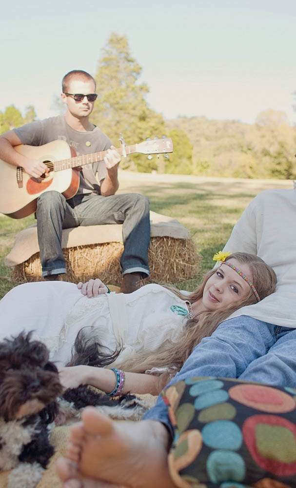 “For the perfect vintage-boho infusion, (and to honor my grandmother) I chose to wear her wedding dress, a 1970’s Gunny Sax Prairie style cotton dress. Bo wore jeans and a natural fiber vintage hippie shirt and love beads. We enjoy drum circles and our friends are musicians, so we thought it would be fun to have a reception reminiscent of folk festivals, laid back and personal. Our guests were invited to wear casual clothes (tee-shirts, jeans and bare feet were encourage) and bring their musical instruments. Even our pet Cavapoo, Jack, came along! Our wedding celebration was all about love, sharing and authentic people!”