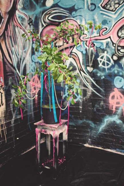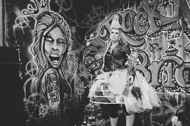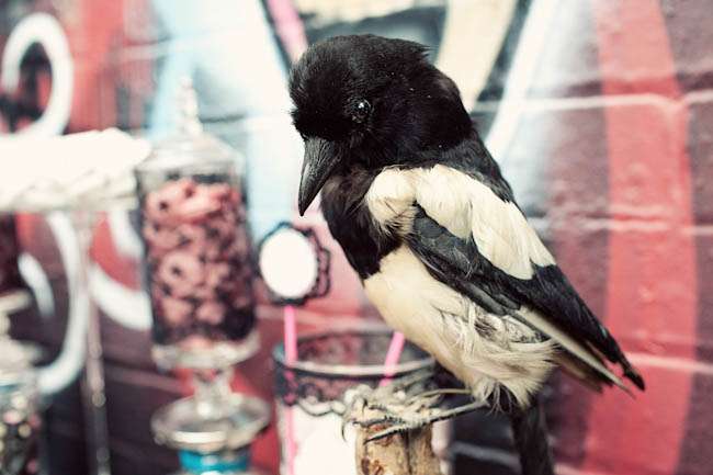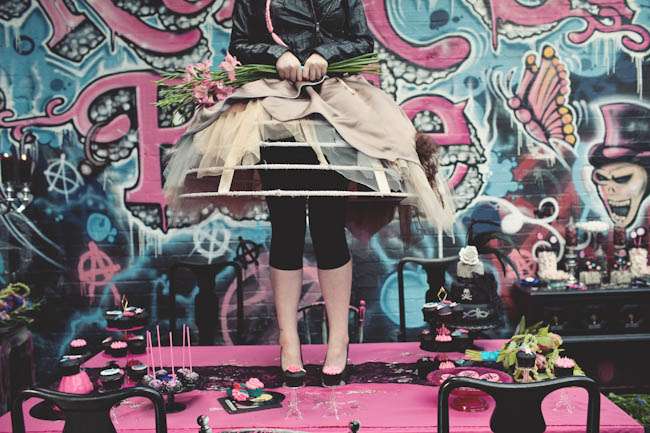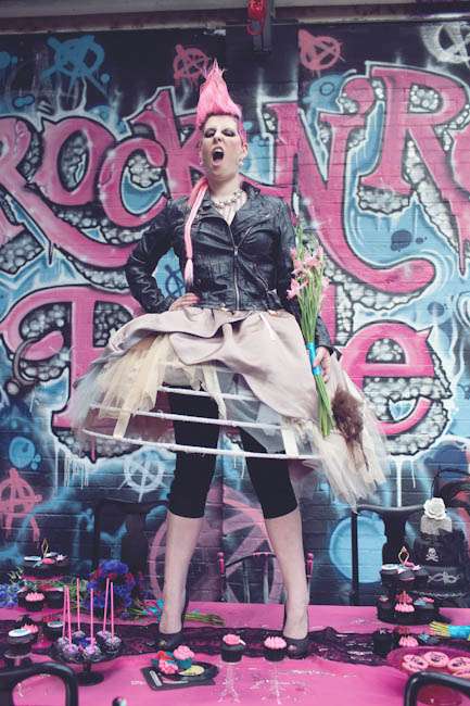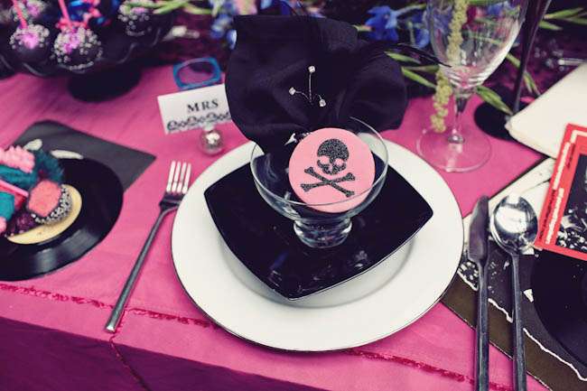 Amy Grzegorzek, one third of Ava Event Styling explains, “When we’re given such an out there brief as the punk riot, it’s important to do our historical research first. It’s a big part of our styling process and something we relish, working out which are the key elements of a particular era is like cherry picking from a giant visual cake! Punk was such a massive part of changing peoples opinions not only on how we looked but how we look at each other. It had its biggest impact in the 1970’s but it opened the floodgates for the diversity in fashion we enjoy today. For Ava this meant we could push the boundaries, using products and props not normally associated with weddings. Safety pin table confetti, taxidermy and a black skull & cross bone wedding cake… Not your normal day in the registry office!”