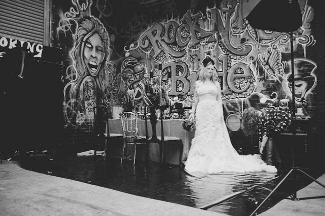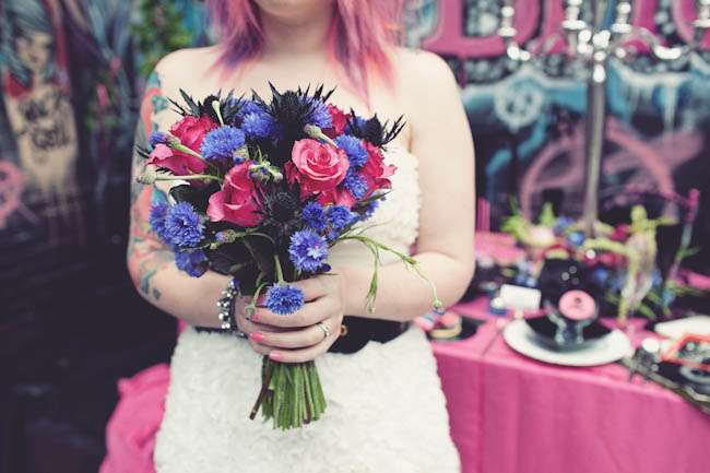 “The flowers used were a mixture of English garden classics and structural tropicals put together more for there textural clashes rather than prettiness. We love to challenge the preconceived ideas in all areas and break from the norm. We are really lucky to be surrounded by like minded independent business owners wanting to do something different. Clare at The Wedding Club let us have free reign to select from their incredible dress collection and was keen to get less well known designers showcased. We even used a dress from a final year fashion student Hannah Wilkins-Webb, it’s important to us to encourage new creative talents. Terry Terry jewellery stepped right up to the mark too with his stunning funky range punk inspired bling.”