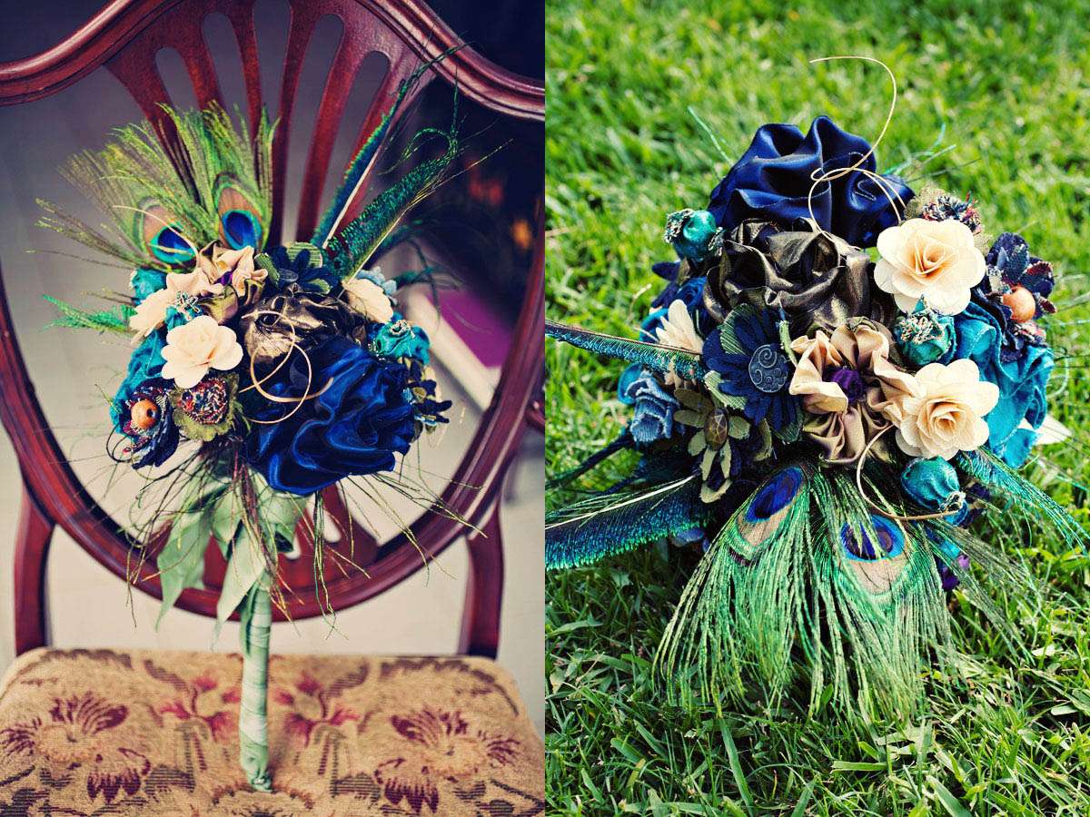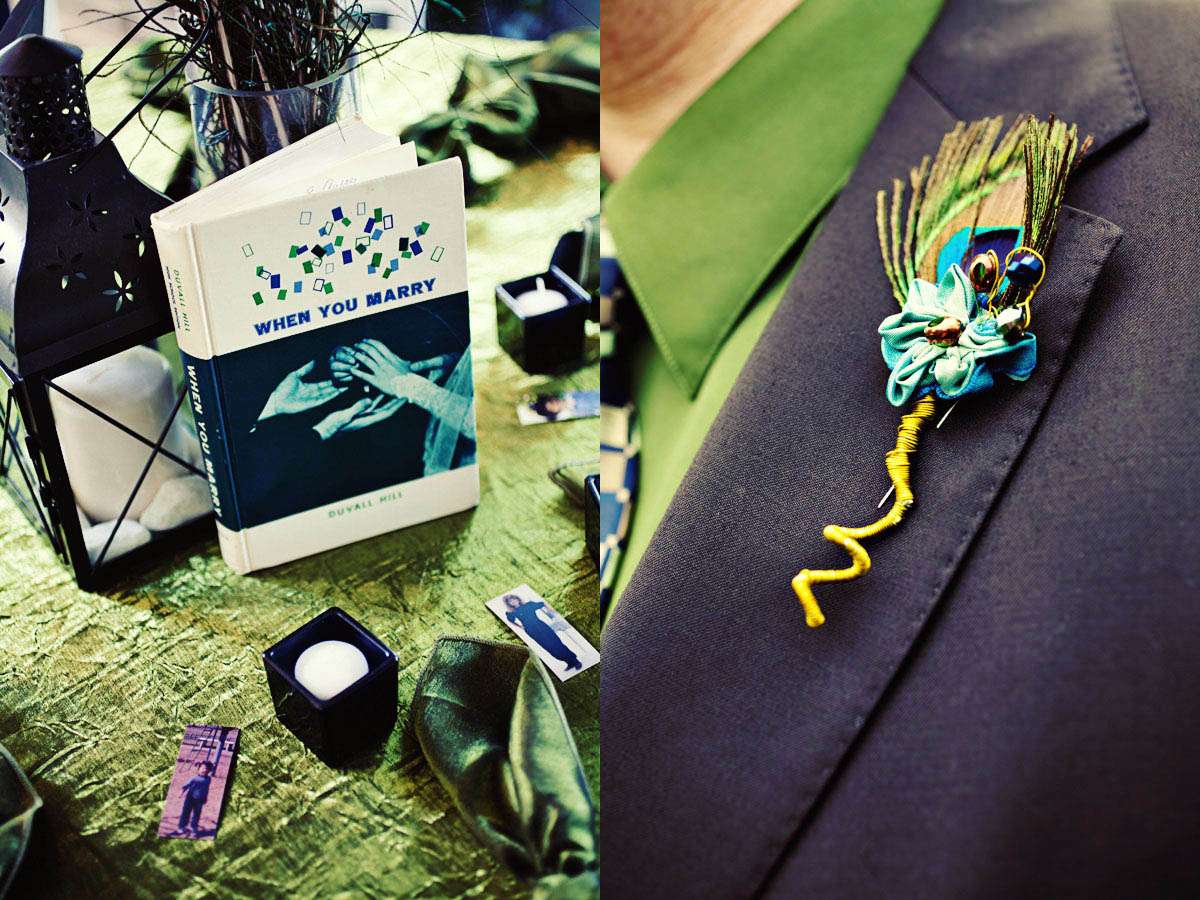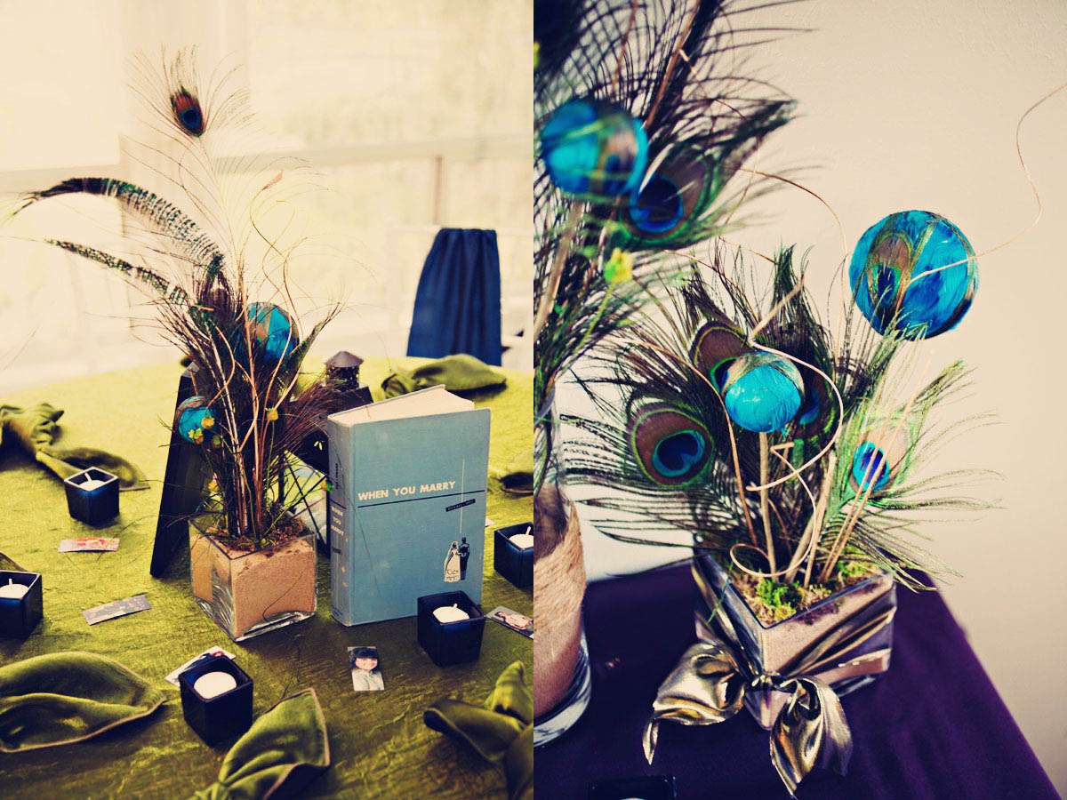“The reception centerpieces focused on peacock-based arrangements with an eclectic assortment of vintage pieces. One that the we especially liked were several copies of “When you Marry”, a home economics book from the 1950’s and 1960’s with many “antiquated” attitudes about marriage.”