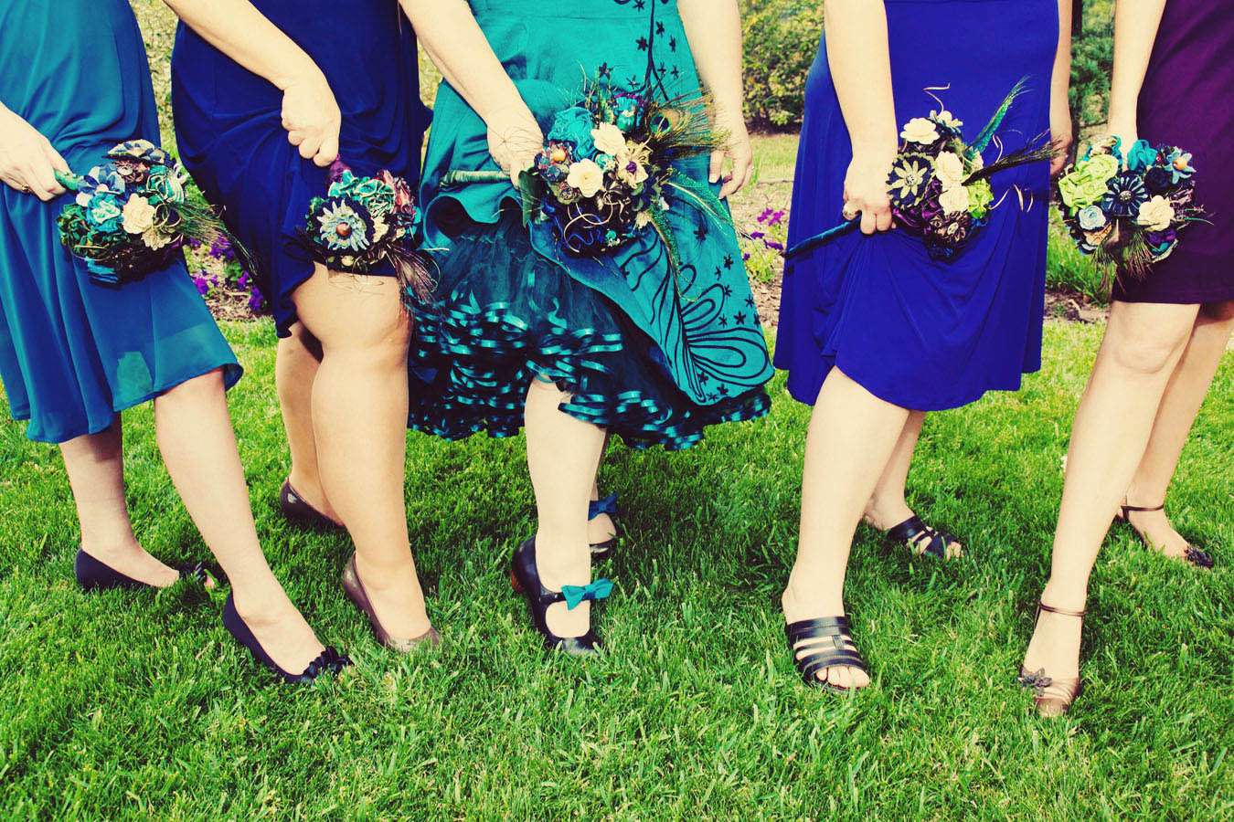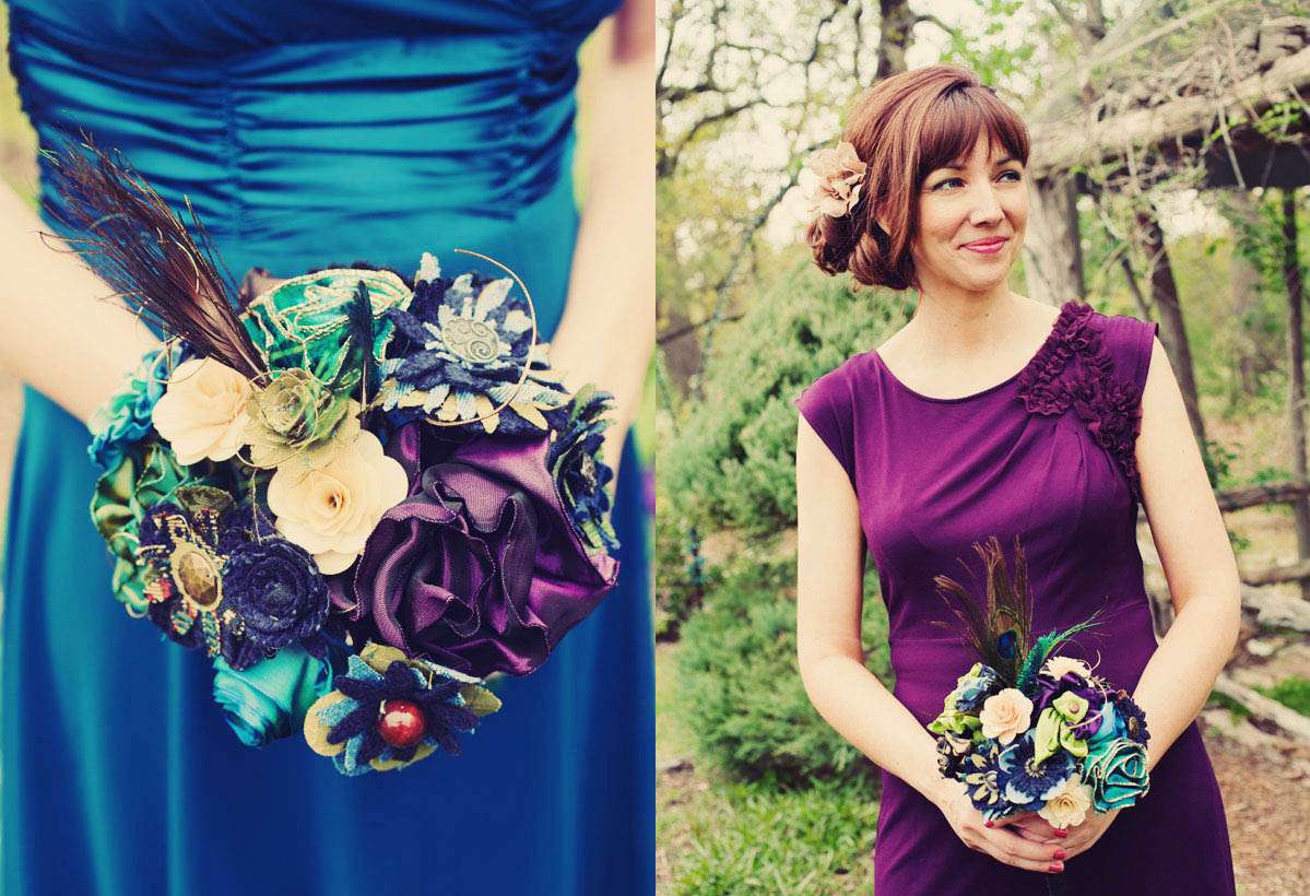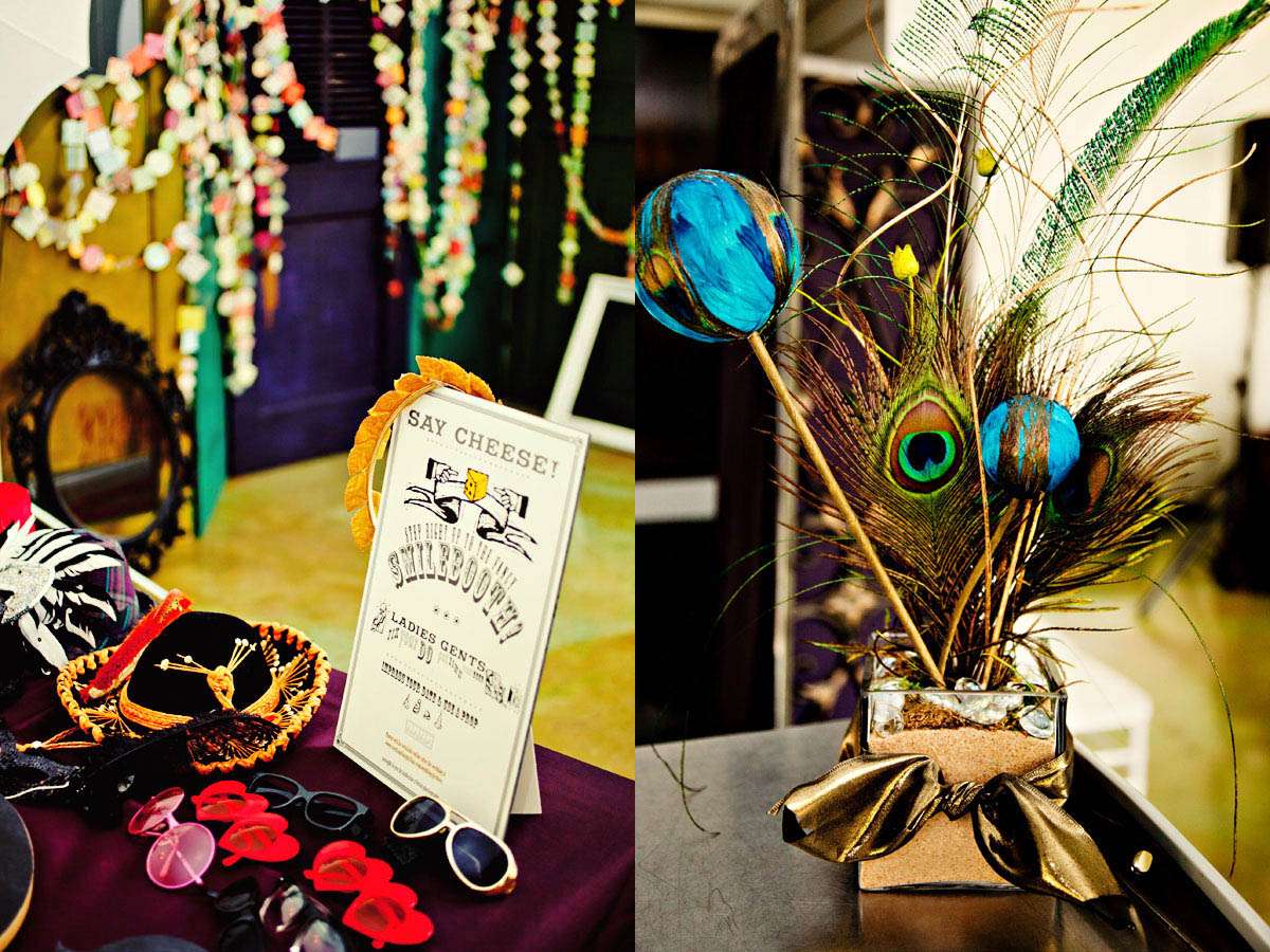 “The reception centerpieces focused on peacock-based arrangements with an eclectic assortment of vintage pieces. One that the we especially liked were several copies of “When you Marry”, a home economics book from the 1950’s and 1960’s with many “antiquated” attitudes about marriage.”